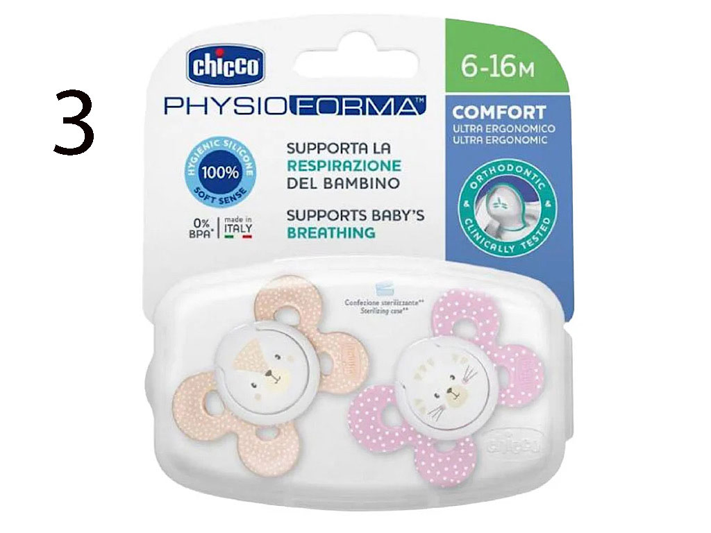 پستانک ارتودنسی سیلیکونی دو عددی دخترانه 16-6 ماه مدل physio comfort چیکو chicco