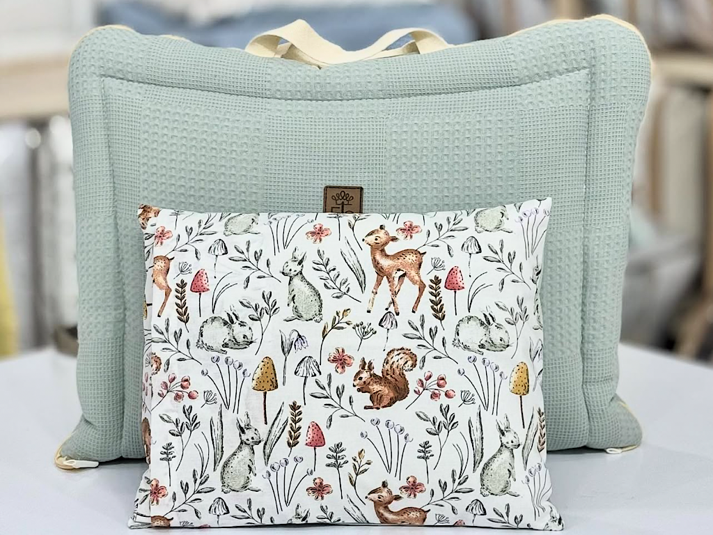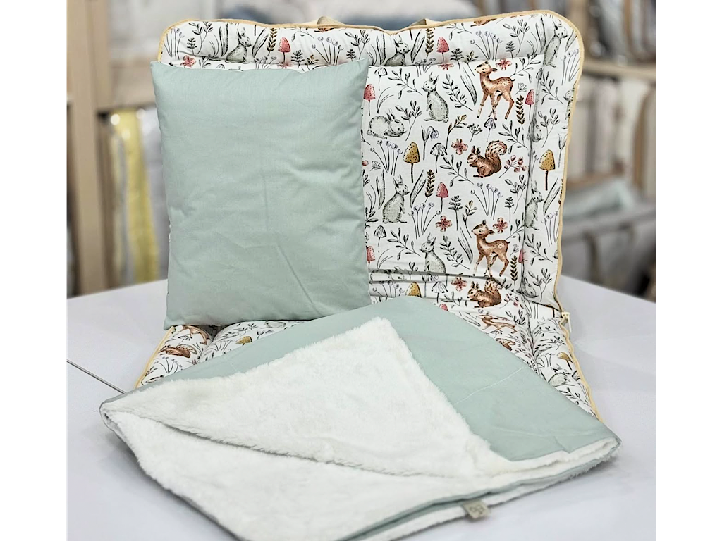 #سرویس خواب دم دستی مسافرتی نوزادی مجموعه 3 عددی تشک، لحاف و بالشت با بسته بندی کیفی طرح چمنزار سبز آبی الا ELA