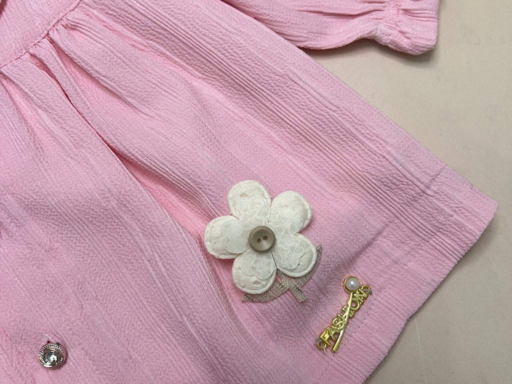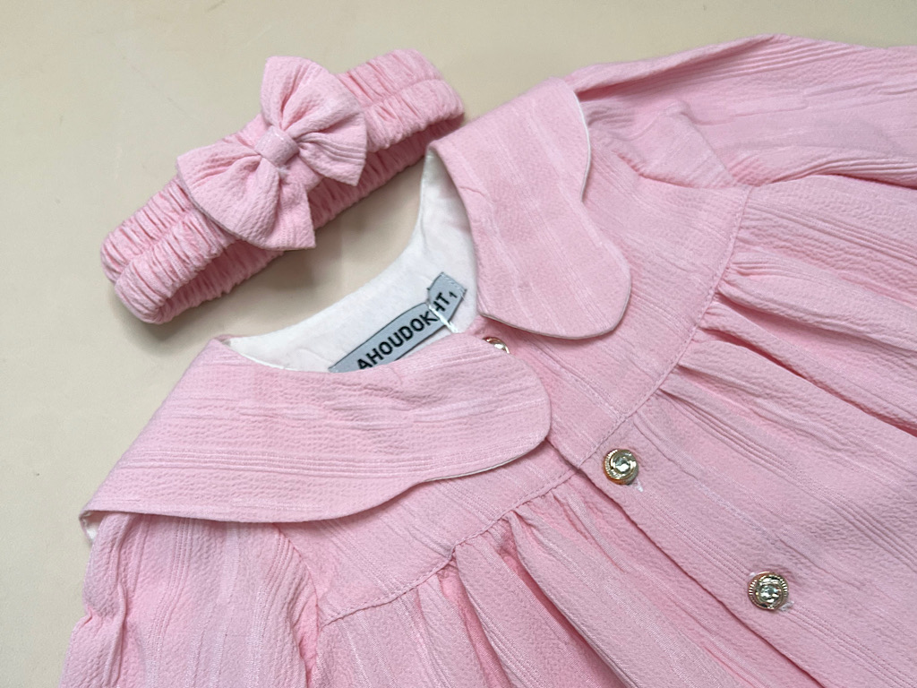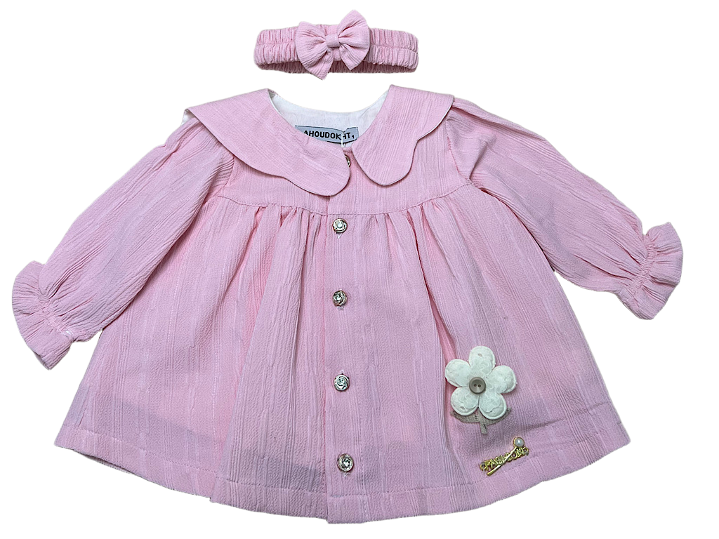 پیراهن آستین بلند دخترانه رنگ صورتی همراه هدبند طرح گل برجسته