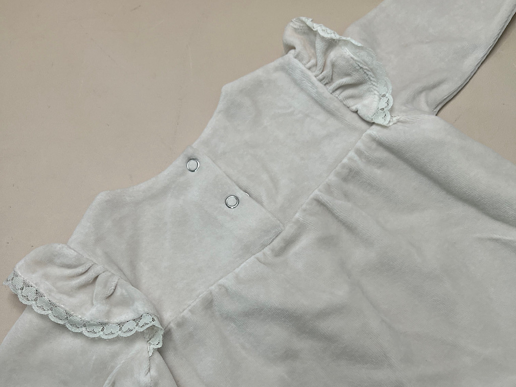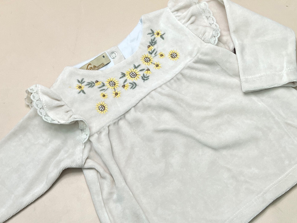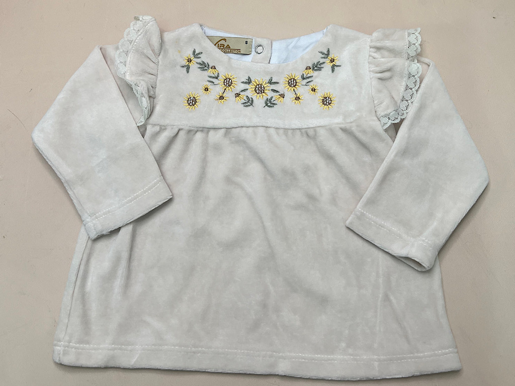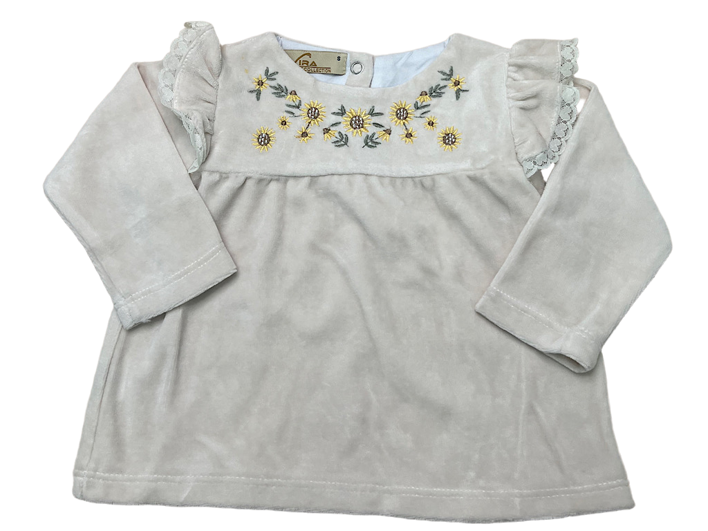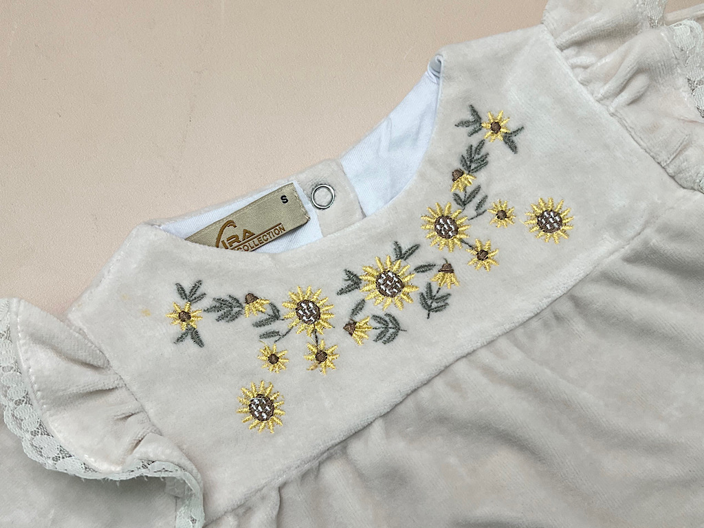 پیراهن کوتاه مخمل دخترانه رنگ کرم روشن طرح گل های گلدوزی شده