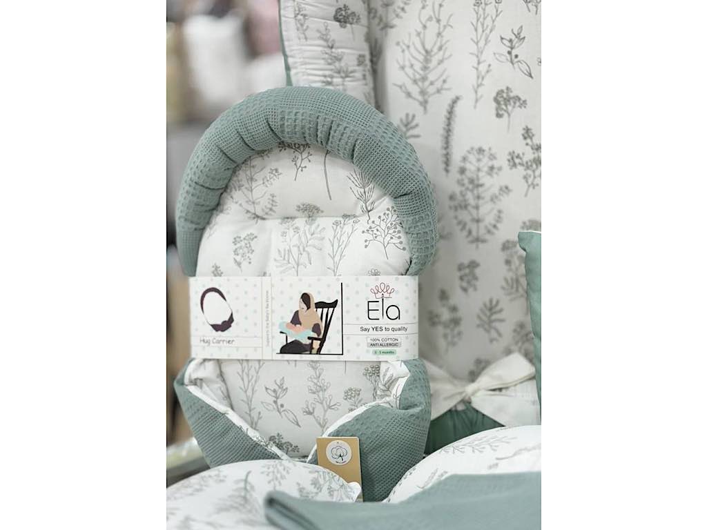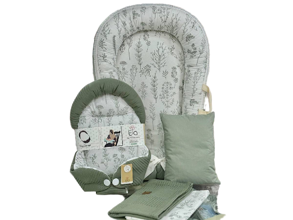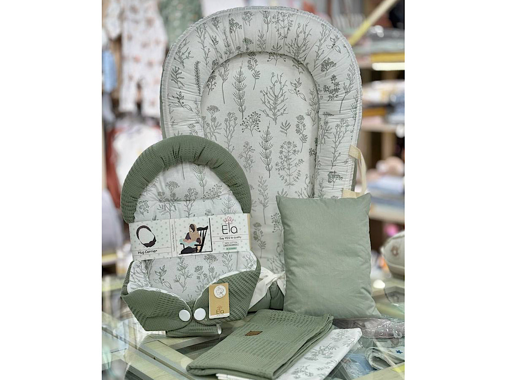 ست تشک لبه دار و آغوشگیر (قنداق سوئیسی) با بالشت و روانداز و زیرانداز تعویض طرح پیکه نبات سبز الا ELA