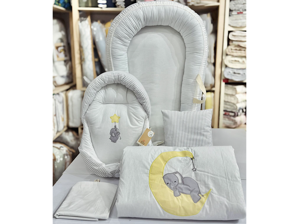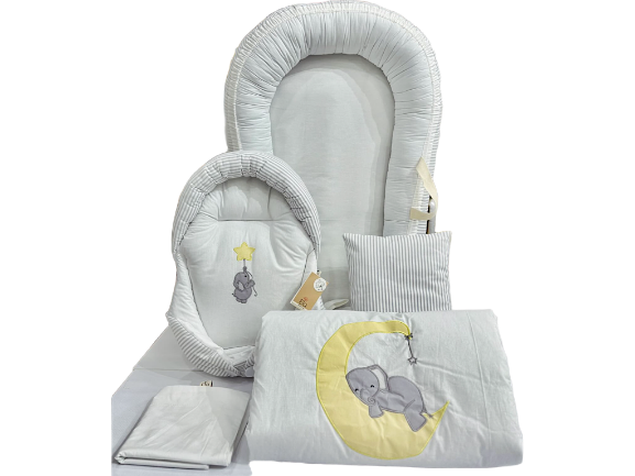 ست تشک لبه دار و آغوشگیر (قنداق سوئیسی) با بالشت و روانداز و زیرانداز تعویض طرح فیل و ماه طوسی الا ELA