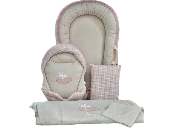 #ست تشک لبه دار و آغوشگیر (قنداق سوئیسی) با بالشت و روانداز و زیرانداز تعویض طرح خرگوش صورتی الا ELA