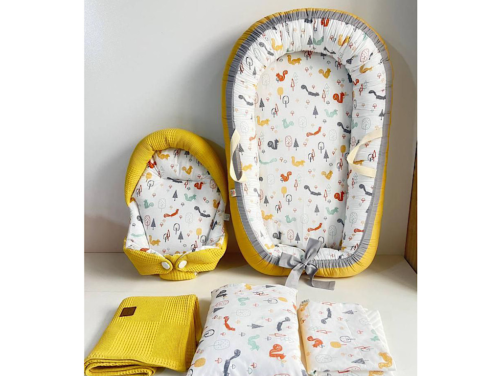 #ست تشک لبه دار و آغوشگیر (قنداق سوئیسی) پیکه با بالشت و روانداز و زیرانداز تعویض طرح سنجاب خردلی الا ELA