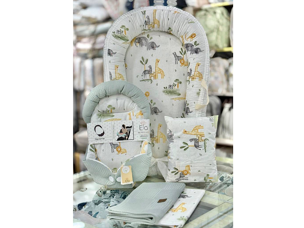 #ست تشک لبه دار و آغوشگیر (قنداق سوئیسی) پیکه با بالشت و روانداز و زیرانداز تعویض طرح سافاری زرد و سبزآبی الا ELA