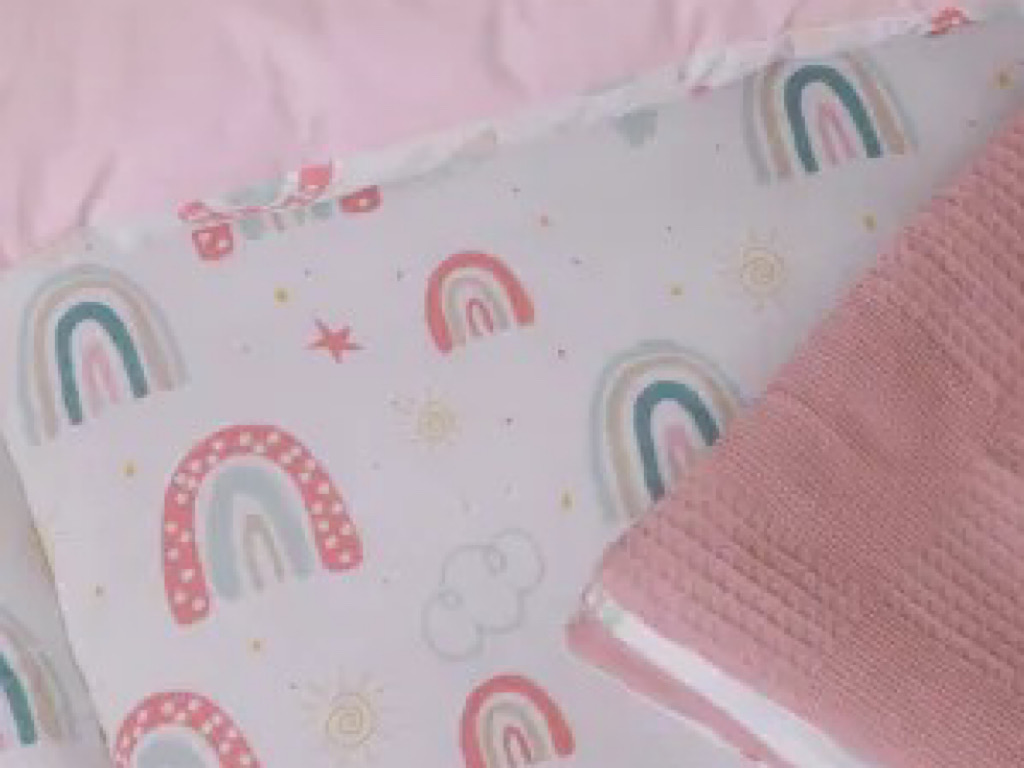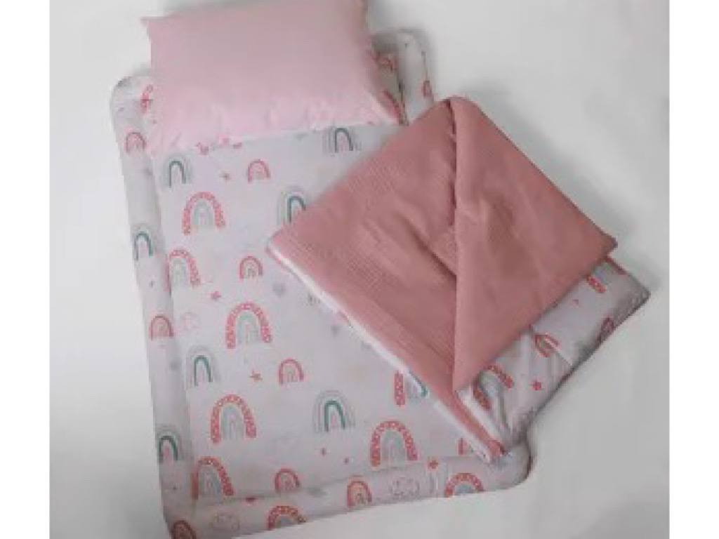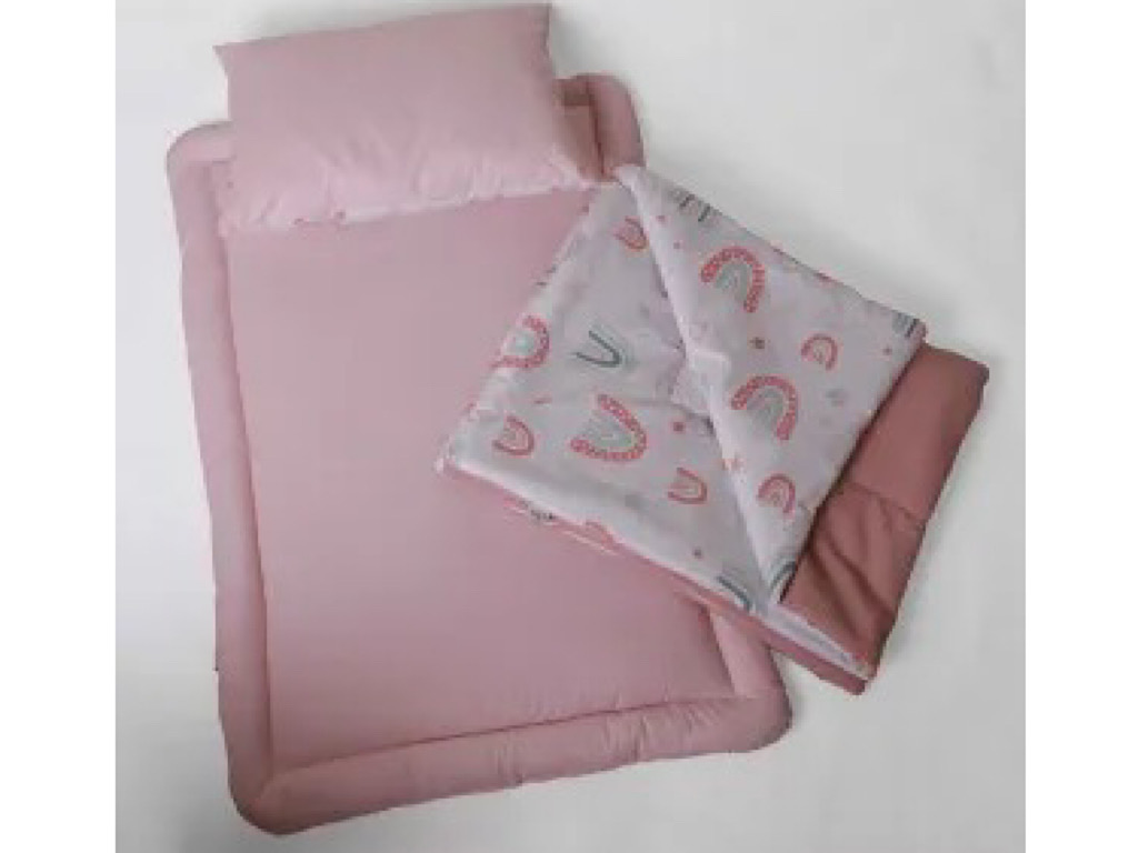 #سرویس خواب دم دستی مسافرتی نوزادی(سایز 2)مجموعه 3 عددی تشک، لحاف و بالشت طرح رنگین کمان آبرنگی صورتی الا ELA