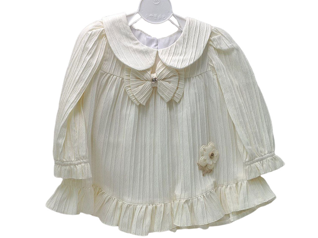 پیراهن آستین بلند دخترانه یقه ب.ب رنگ شیری طرح پاپیون و گل