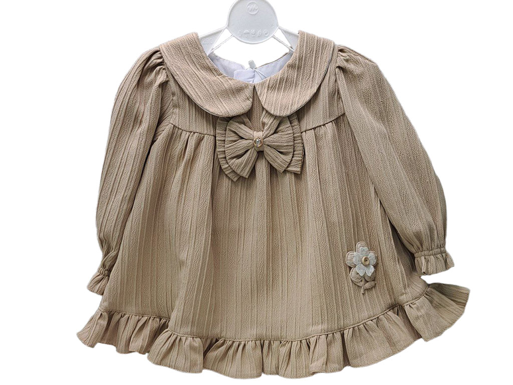پیراهن آستین بلند دخترانه یقه ب.ب رنگ نسکافه ای طرح پاپیون و گل