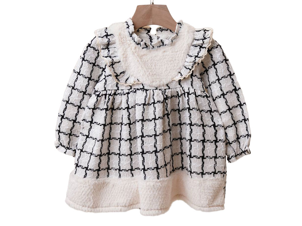 پیراهن دخترانه طرح چهارخانه سفید مشکی خزدار