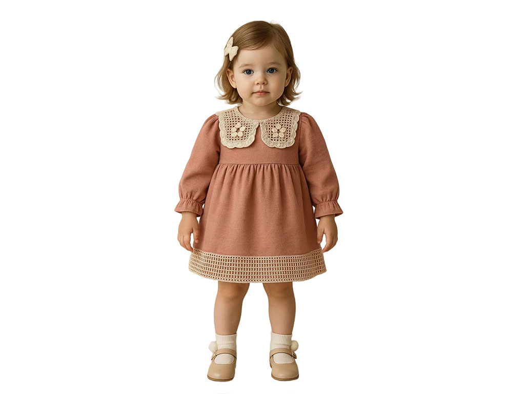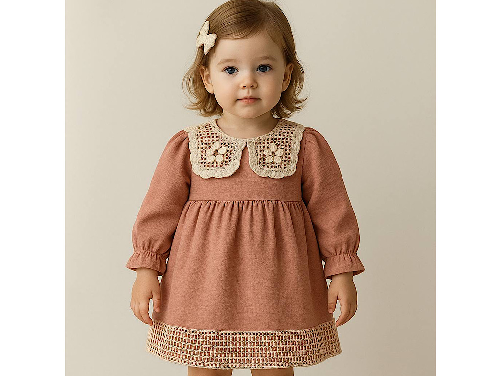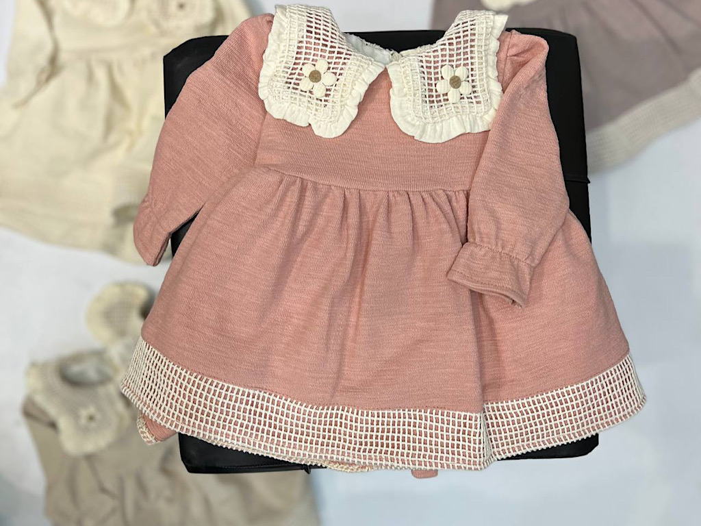 پیراهن آستین بلند بوکله دخترانه یقه دراپه رنگ صورتی