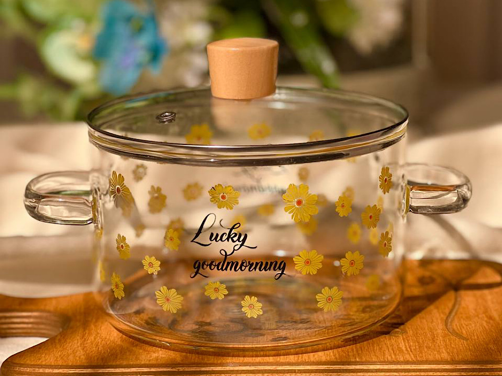 قابلمه پیرکس با حجم 1800 میلی لیتر و طرح گل زرد بر روی آن، به همراه درب و دسته هایی که در دو طرف آن کار شده است. این محصول قابلیت استفاده در مایکروویو ،اجاق برقی و شعله مشتقیم آتش را دارد. و در تهیه این محصول از موادی با کیفیت استفاده شده است.