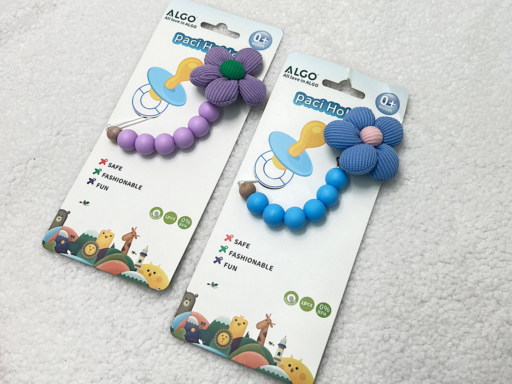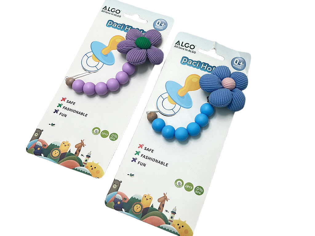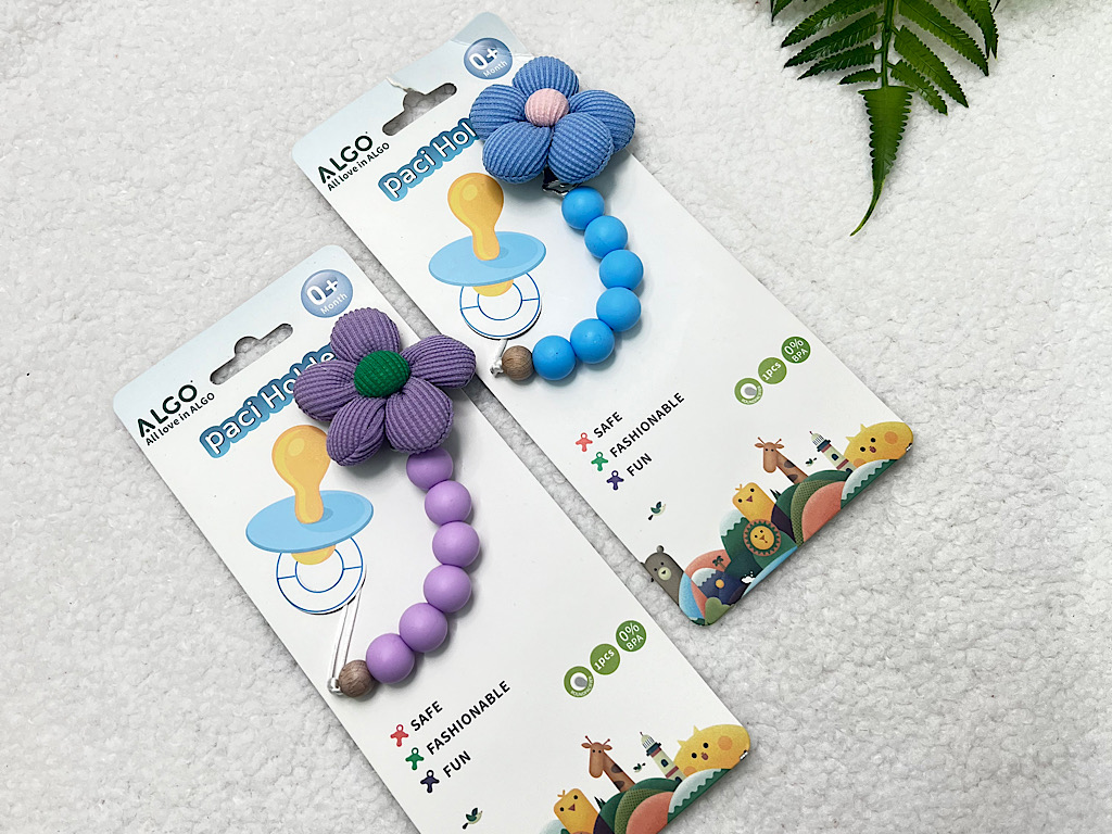 این محصول به صورت مهره های سیلیکونی بوده که انتهای آن یک مهره چوبی و ابتدای محصول دارای یک گل از جنس پارچه میباشد.