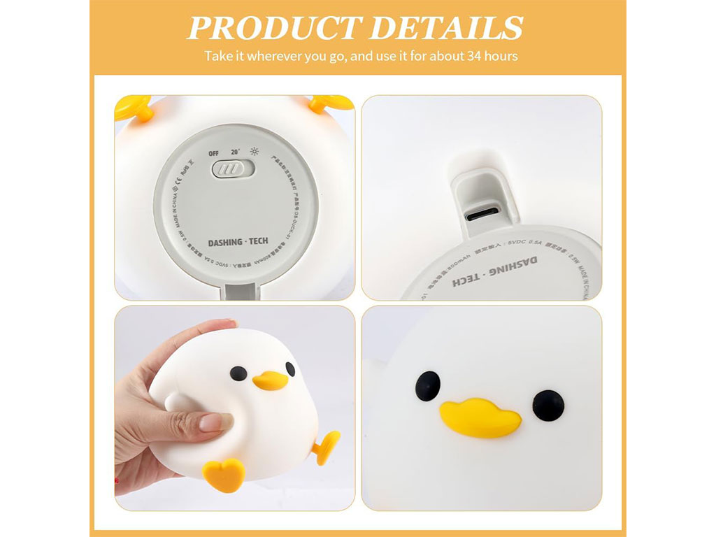 چراغ خواب سیلیکونی اتاق کودک با طرح جوجه سفید رنگ جهت روشن شدن فضای اطراف اتاق دلبندان شما می باشد. این چراغ خواب توسط دکمه on/off که زیر آن قرار گرفته است روشن و خاموش شده و توسط کابل شارژی که درون بسته بندی ان قرار گرفته است، قابل شارژ می باشد. لازم به ذکر است که با فشردن سر جوجه می توانید شاهد طیف نورهای مختلف این چراغ خواب باشید.