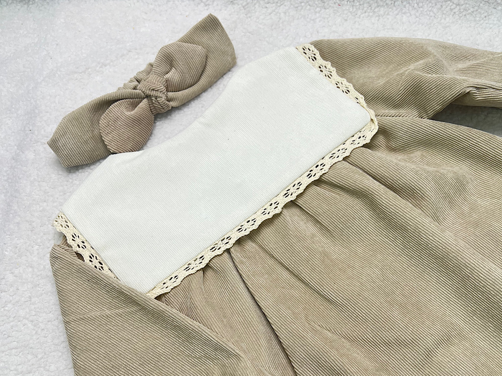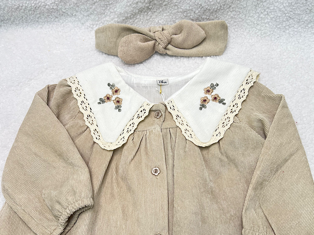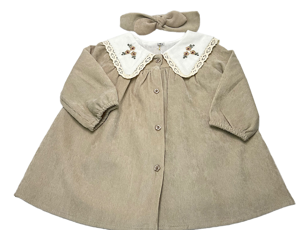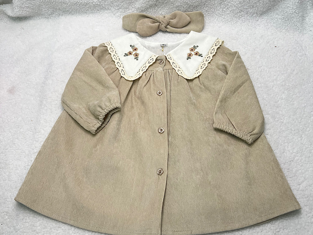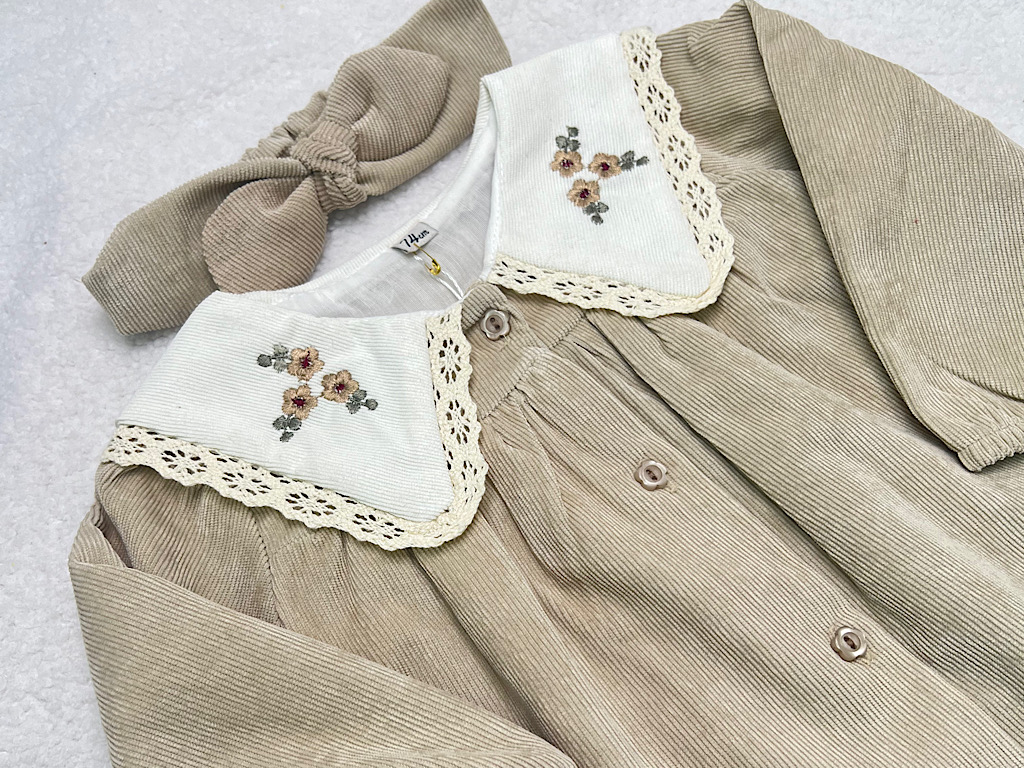 پیراهن دخترانه جنس مخمل کبریتی یقه گلدوزی کرم روشن