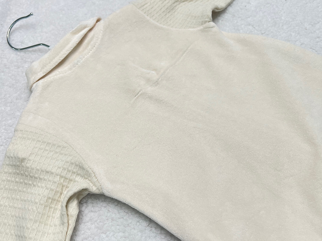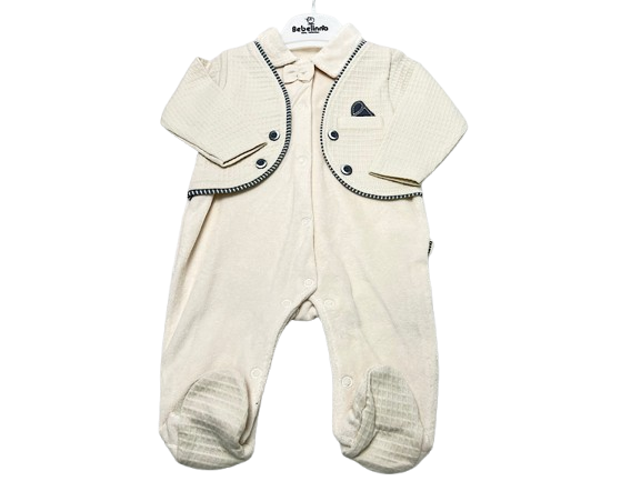 سرهمی جورابدار مجلسی پسرانه نوزادی از جنس مخمل با ترکیب رنگ کرم که جلیقه طرح دار زیبایی به آن دوخته شده است . مدل یقه این سرهمی به صورت یقه انگلیسی کار شده و توسط دکمه های فشاری که از روی یقه تا بین پاها کار شده، به راحتی باز و بسته می شود