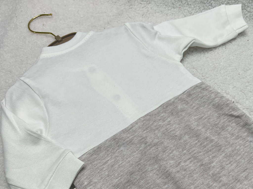 سرهمی جورابدار مجلسی پسرانه نوزادی از جنس نخ پنبه با ترکیب رنگ شیری نسکافه ای که جلیقه طرح دار زیبایی به آن دوخته شده است . مدل یقه این سرهمی به صورت یقه هفت کار شده و توسط دکمه های فشاری که از روی یقه تا بین پاها کار شده، به راحتی باز و بسته می شود