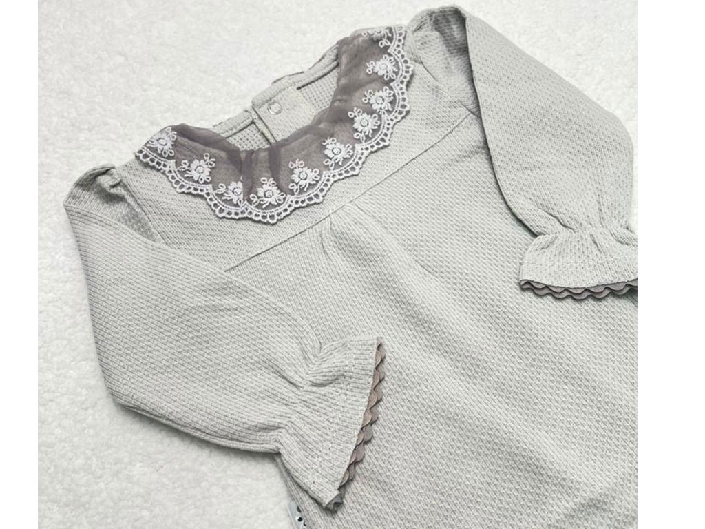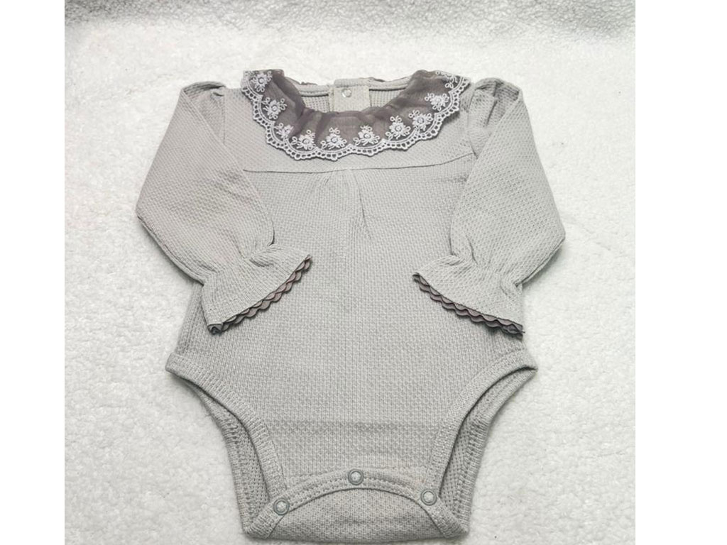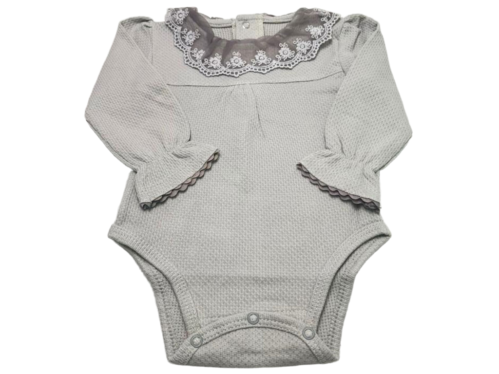 بادی آستین بلند نوزادی دخترانه رنگ طوسی یقه توری