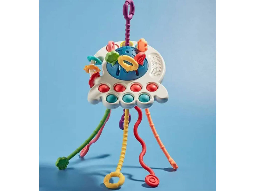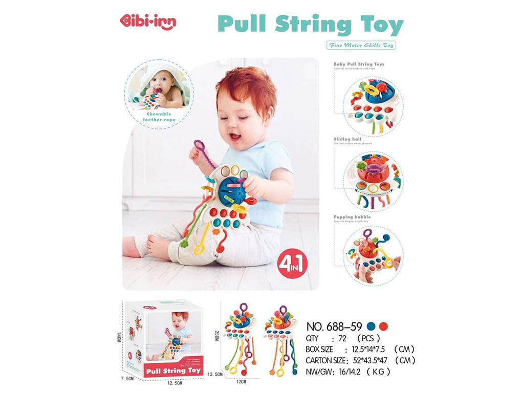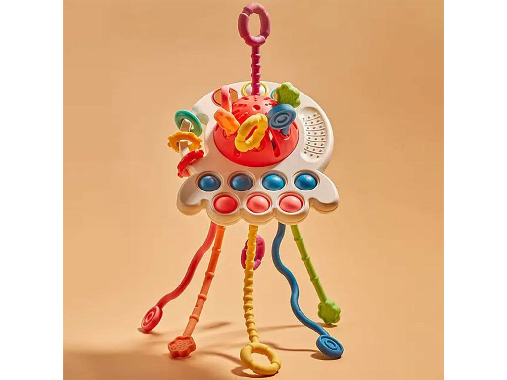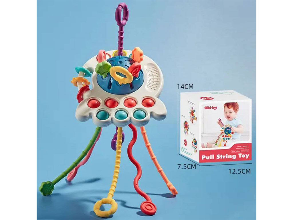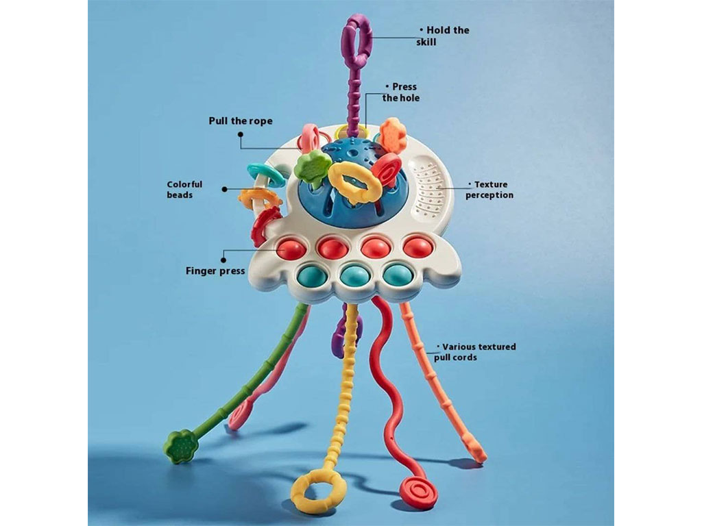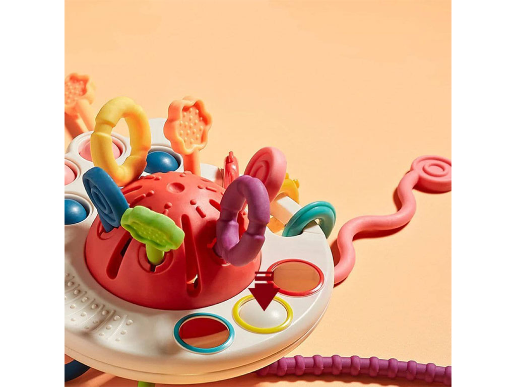 - روی بازی چند وسیله برای فشار دادن و پیجاندن قرار دارد که به افزایش مهارت دست ورزی کمک می کند.