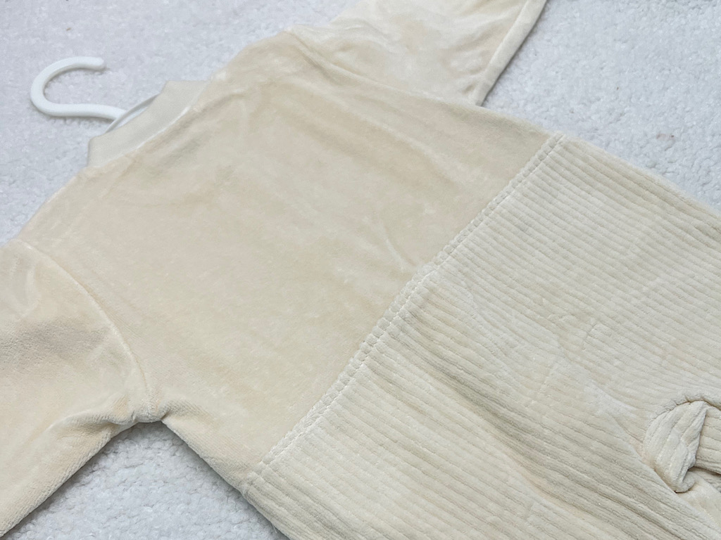 - گلدوزی برجسته طرح خرگوش که حالت بند پیشبندی روی سرهمی نوزادی دارد.