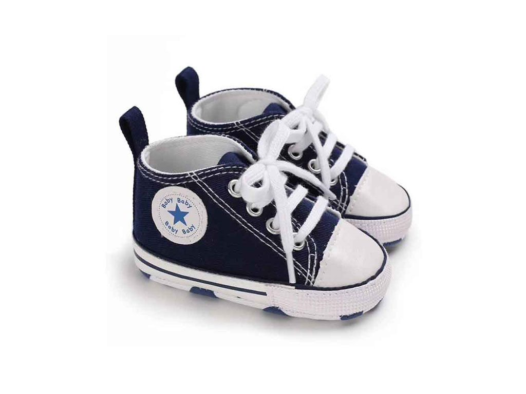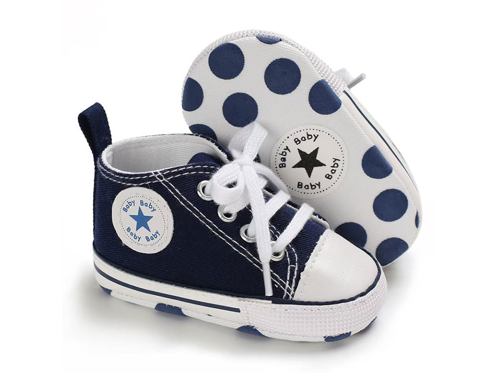 پاپوش استپ دار نوزادی پسرانه با طرح آل استار Baby Baby دارای سه سایز 0-6 و 6-12 و 12-18 ماه می باشد.جنس رویه این محصول ترکیب پارچه به رنگ سرمه ای و چرم مصنوعی در قسمت نوک پاپوش بوده و توسط چهار ردیف بند به راحتی پای دلبندان می شود که بسیار شیک و بی نظیر است.
