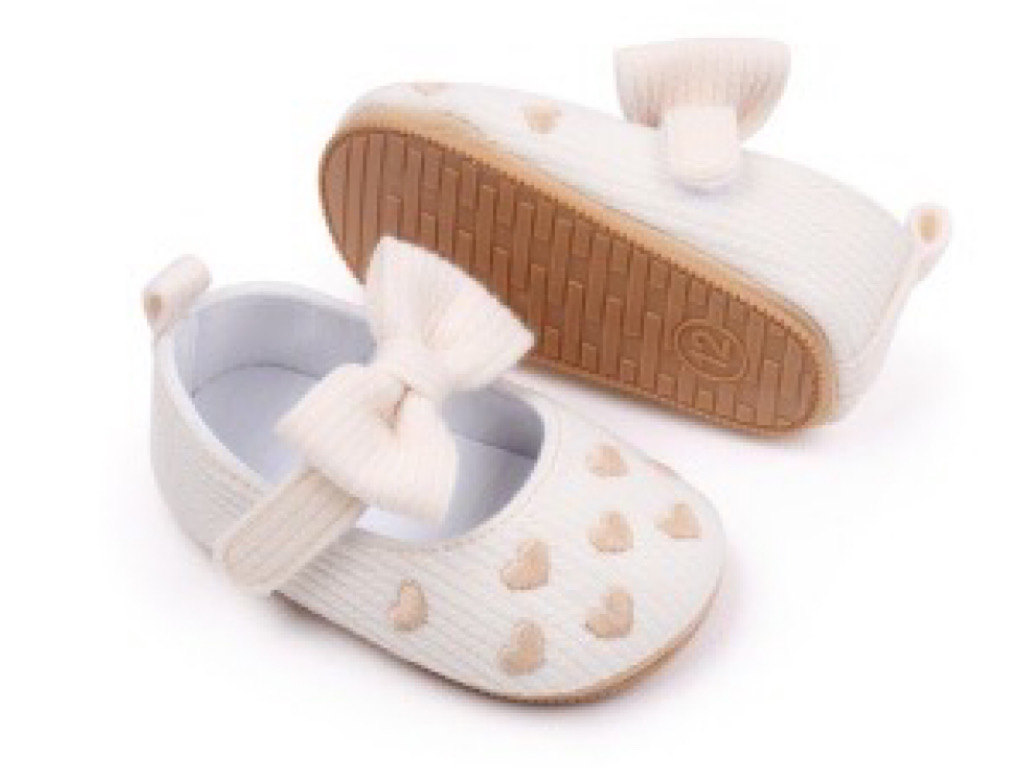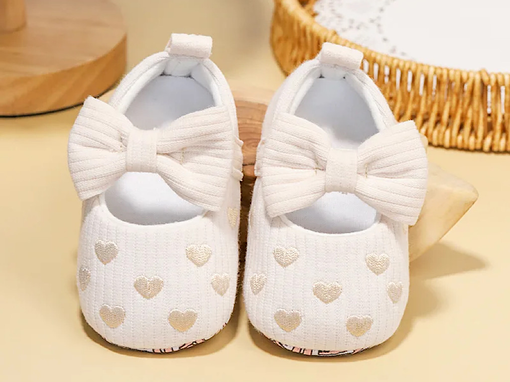 #پاپوش نوزادی دخترانه به رنگ سفید که بند چسبی همراه با پاپیون دارد و دارای طرح قلب است.