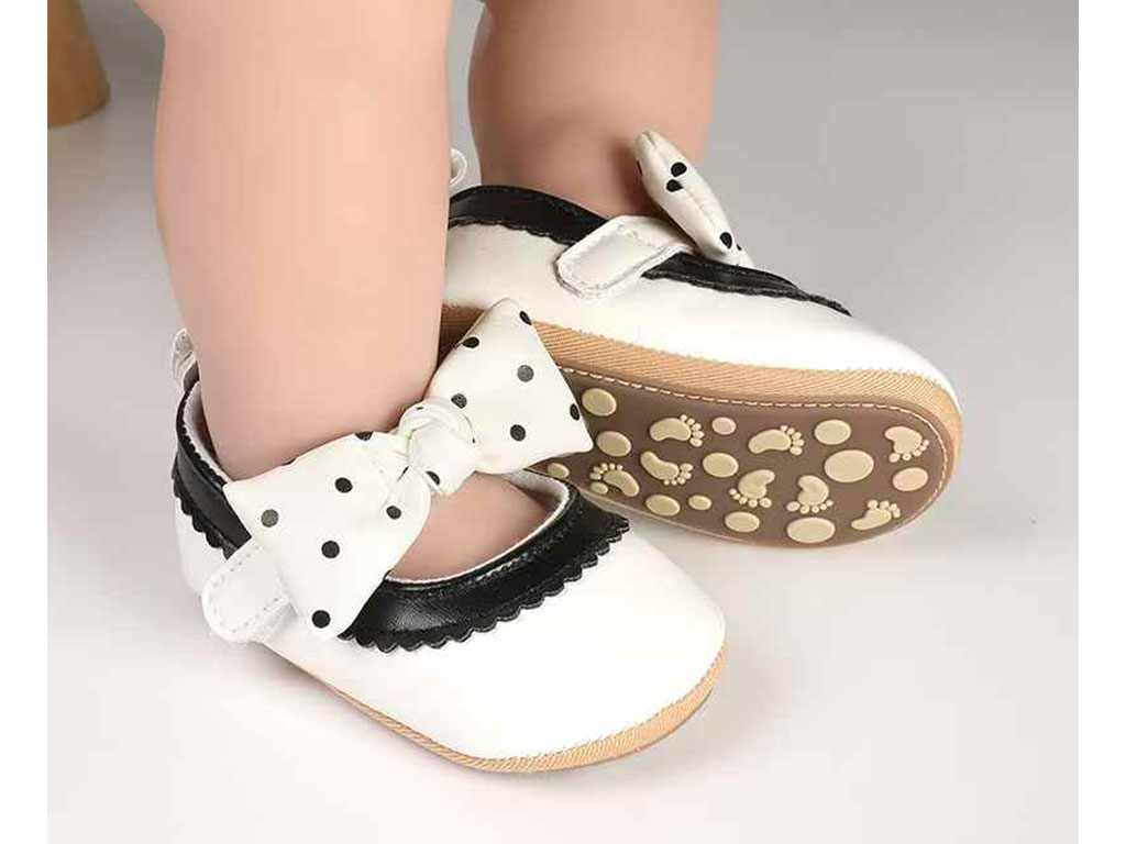 پاپوش سفید رنگ استپ دار نوزادی دخترانه طرح پاپیون چین دار مشکی