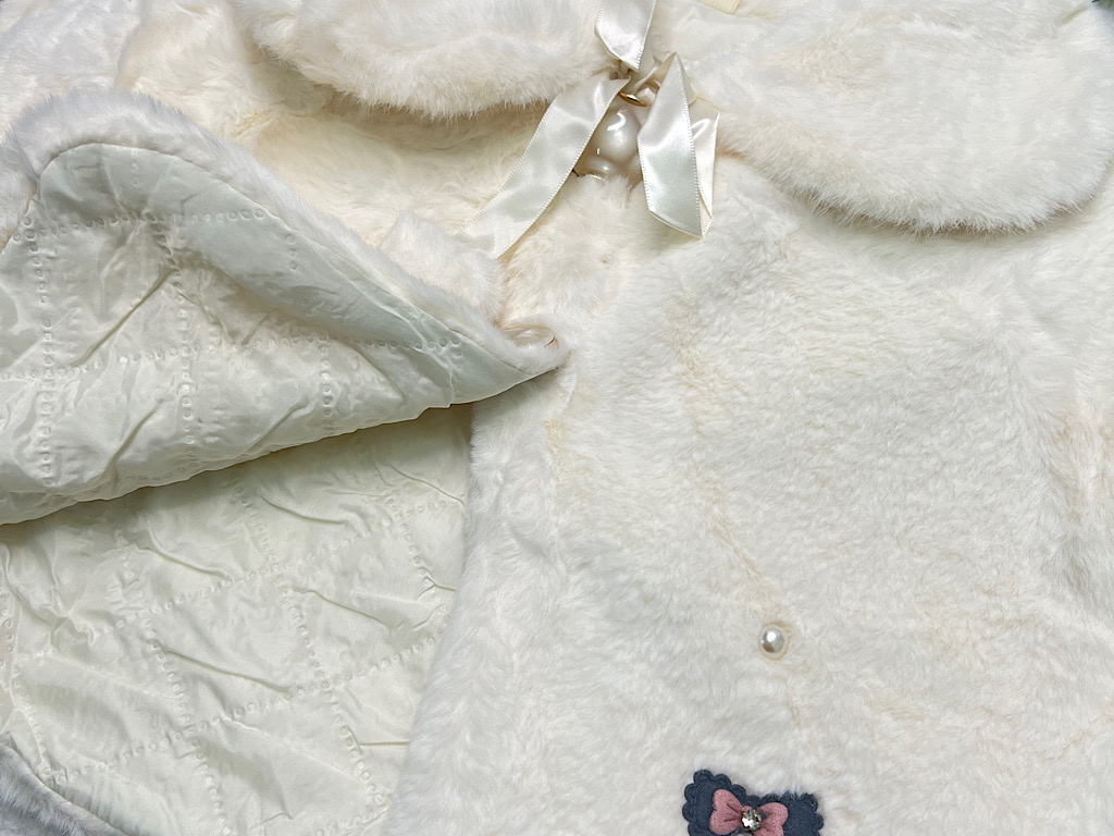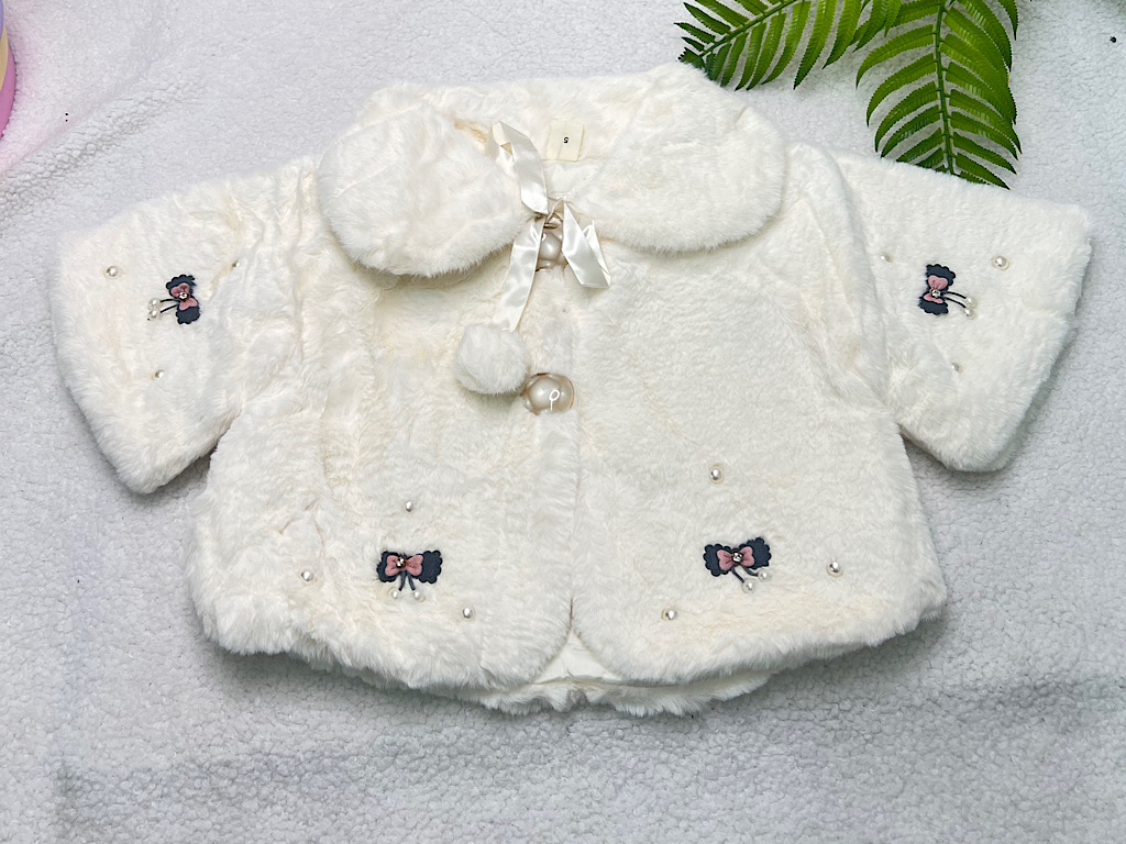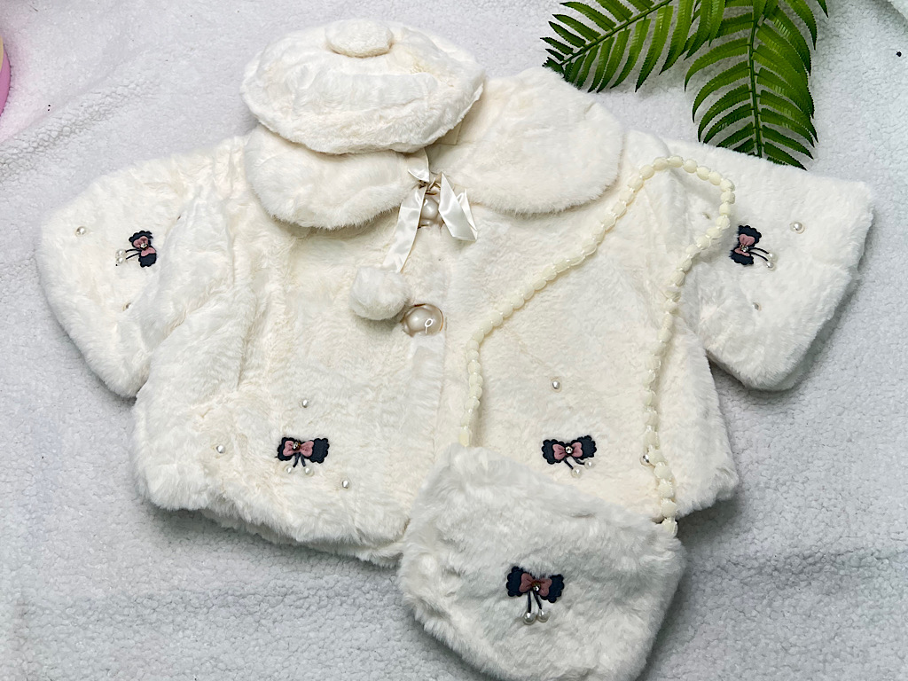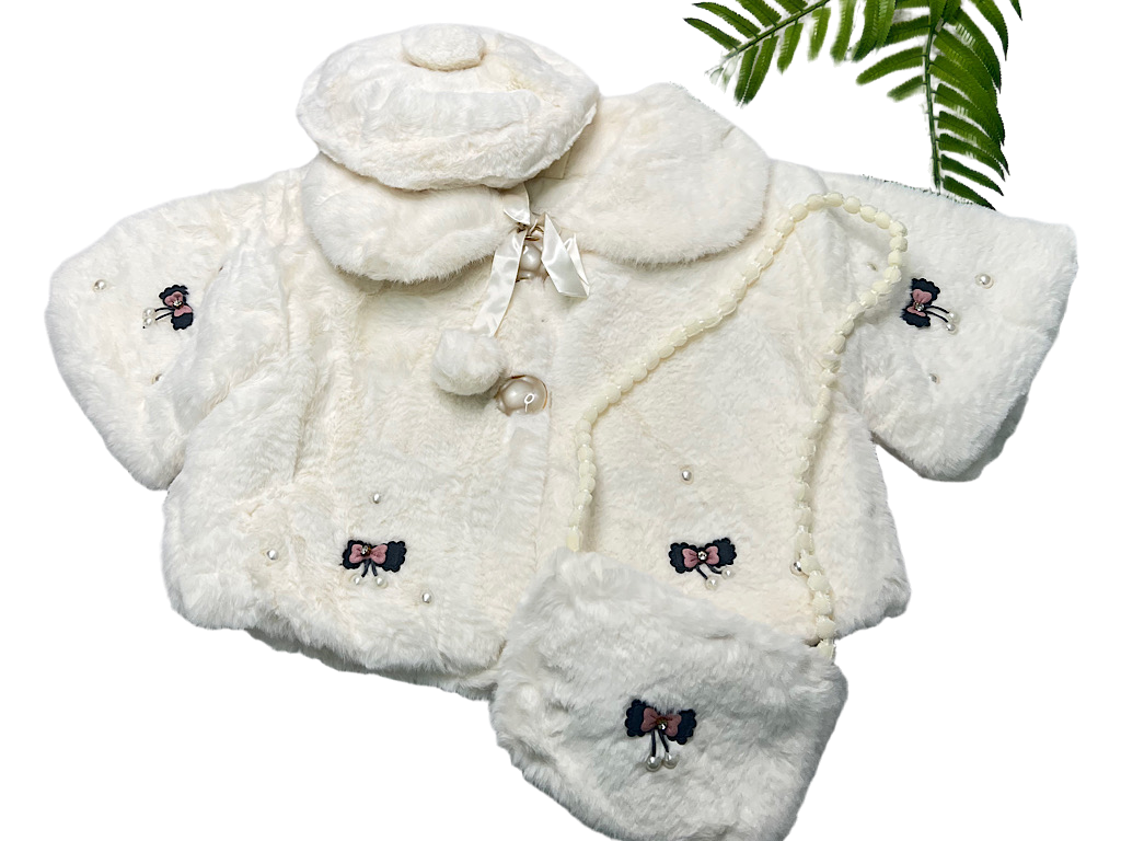 کاپشن طرح شنل با کیف و کلاه ، کاپشن نوزادی دخترانه که طرح شنل است و طراحی بسیار جذاب و شیکی دارد. یک عدد کلاه نیز این کاپشن زیبا را تکمیل می نماید. جنس کاپشن و کلاه کرکی است و به رنگ شیری می باشد. جلوی کاپشن و بر روی آستین ها آن کلاه های برجسته زیبایی خودنمایی می کنند که جلوه خاص و چشم نوزادی به این کاپشن نوزادی بخشیده است.