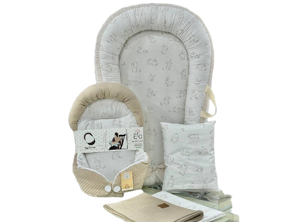 #ست تشک لبه دار و آغوشگیر (قنداق سوئیسی) پیکه با بالشت و روانداز و زیرانداز تعویض طرح خرگوش خطی نسکافه ای ELA