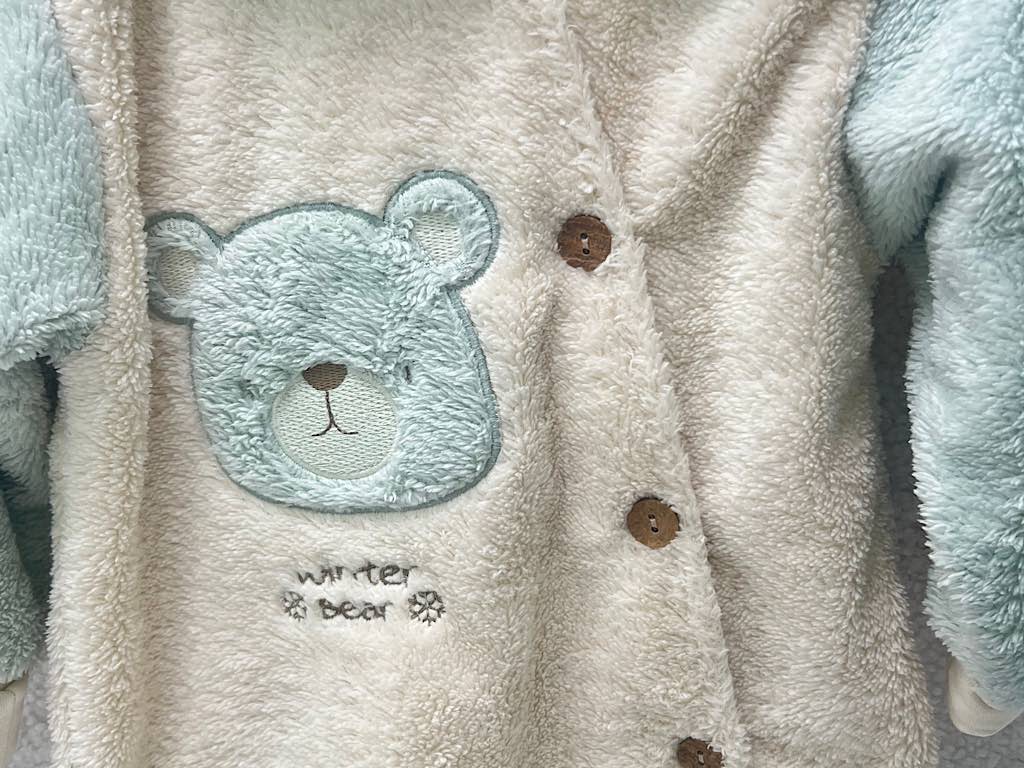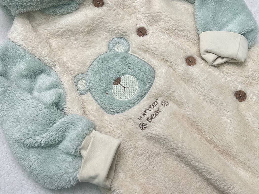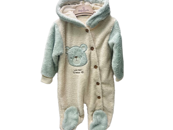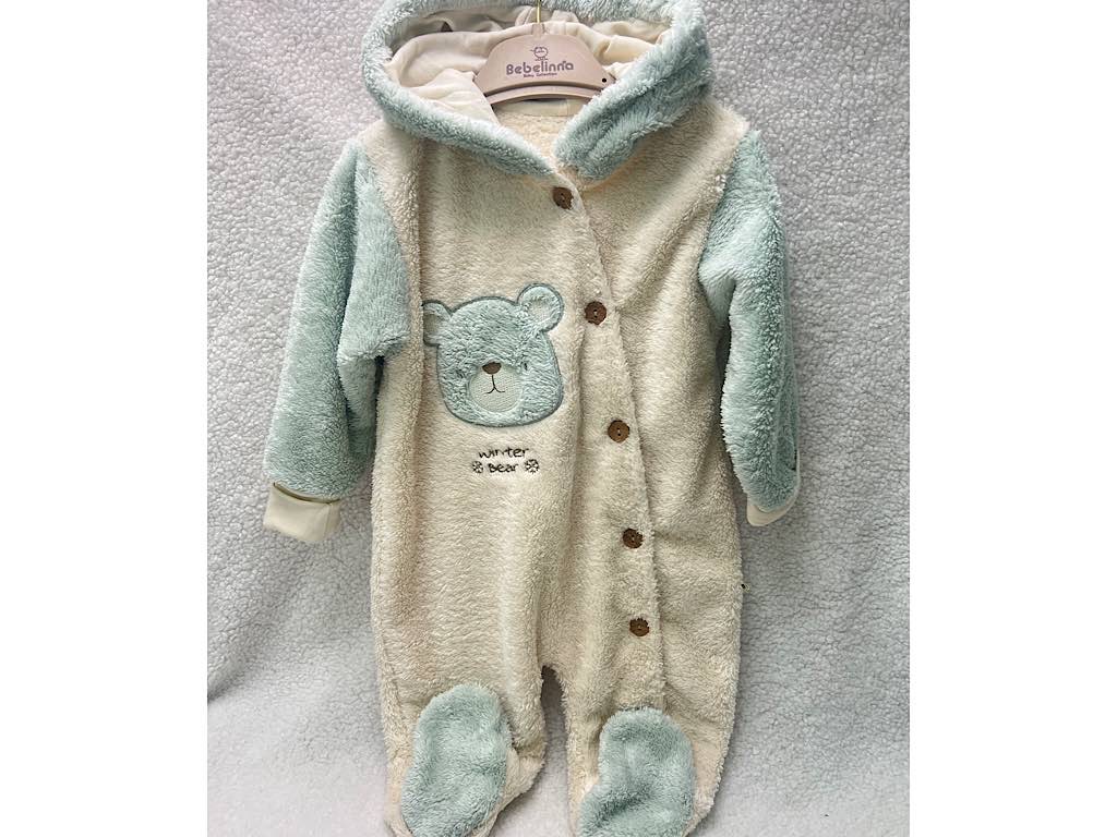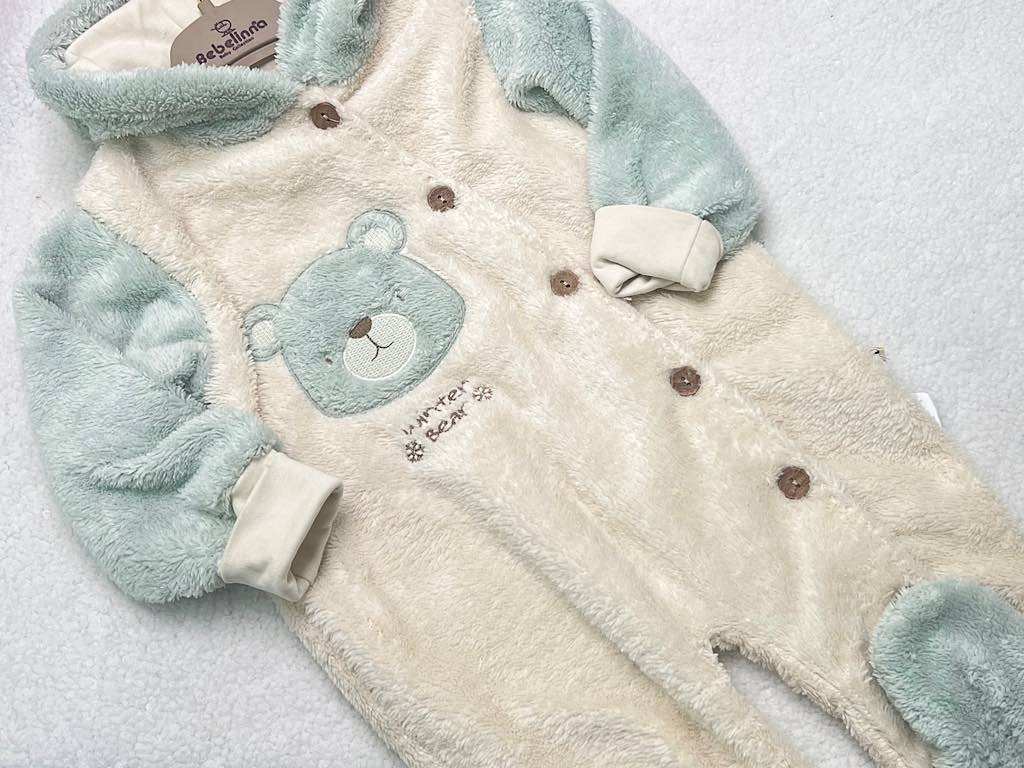 سرهمی کلاهدار و جورابدار نوزادی پولیشی طرح خرس کرم و سبز رنگ ب ب لینا BEBELINNA
