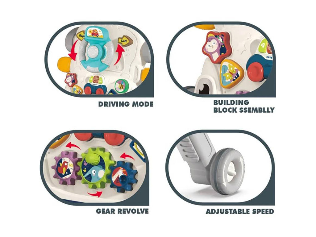 - قابل تبدیل به میز بازی، سه چرخه، واکر و اسکوتر
