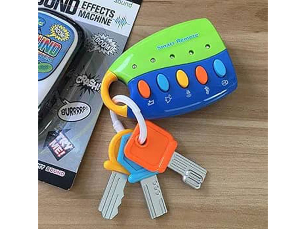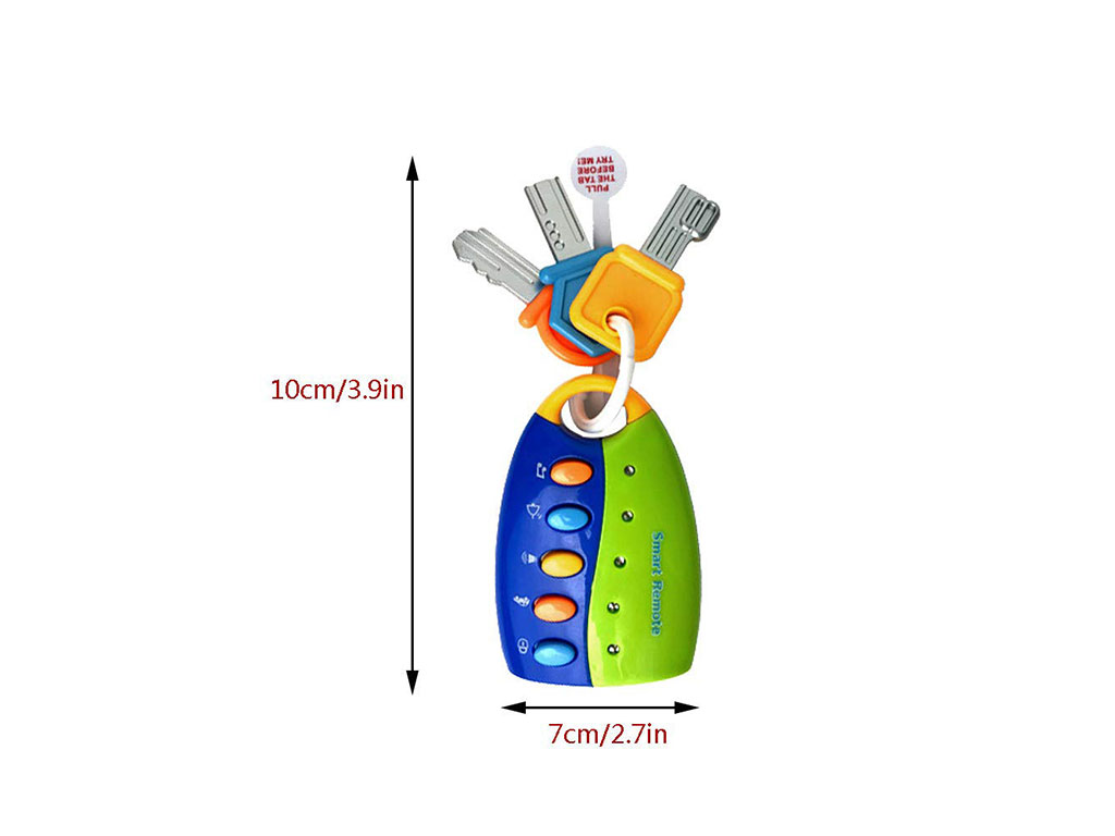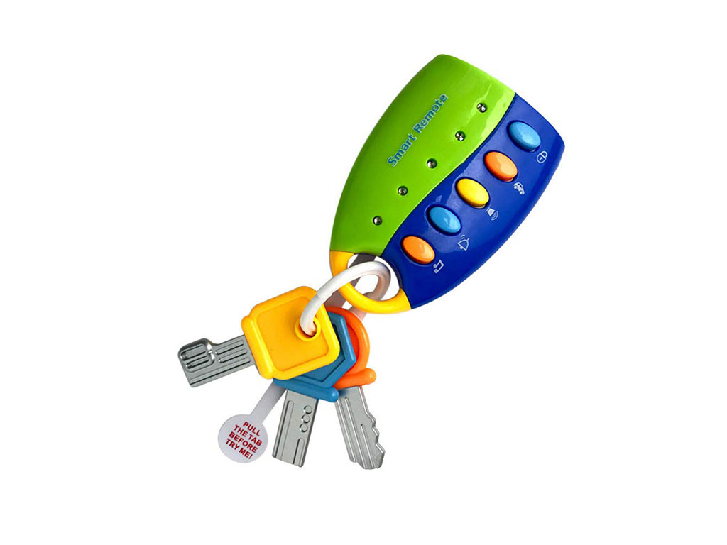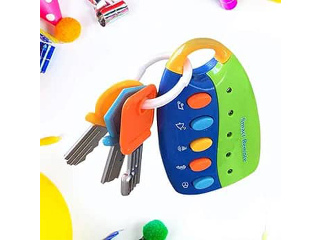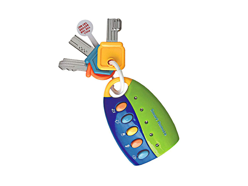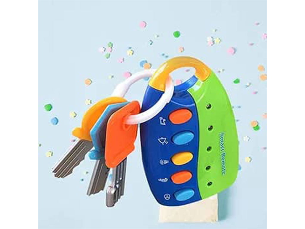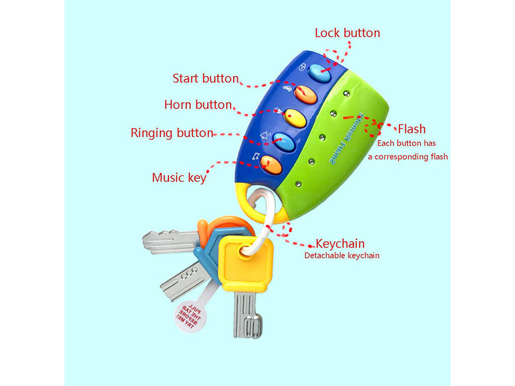 شرح بازی : ریموت موزیکال با کلید یک اسباب بازی کاملا کاربردی برای دوران نوزادی است. این اسباب بازی از دو بخش کلید و ریموت تشکیل شده است . کلیدها جنسی پلاستیکی ، بدون هیچگونه ی لبه ی تیز و برنده هستند . ریموت نیاز به دو عدد باطری دارد . پنج عدد دکمه روی ریموت موجود بوده که با فشردن هر کدام علاوه بر صدا دکمه ی چراغ کناری نیز روشن می شود. دکمه های روی ریموت : صدای بوق ماشین صدای استارت اتومبیل صدای قفل کردن اتومیبل پخش آهنگ صدای زنگ