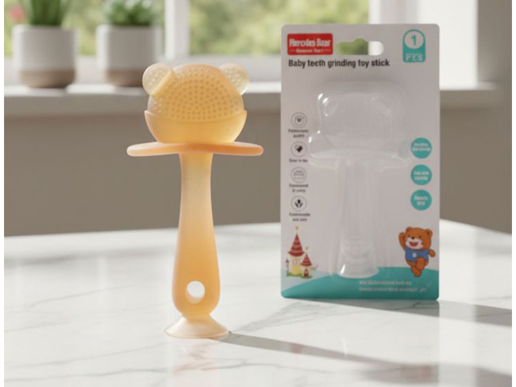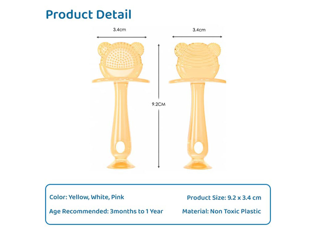 دندانگیر سیلیکونی پایه دار که دارای طرح تدی می باشد و پایه دار است. و جنس آن سیلیکونی است و فاقد مواد مضر بدن (BPA) می باشد و برای بدن و لثه های نوزاد خطری نخواهد داشت. دندانگیرها از وسایل نوزادی مهم و ضروری در تهیه سیسمونی نوزاد دلبند شما می باشد زیرا نوزادان هنگام درآوردن دندان بسیار اذیت شده و این دندانگیرها می توانند لثه نوزاد را ماساژ داده و در کاهش التهاب لثه های نوزاد دلبند شما موثر واقع شوند. این دندانگیرها به راحتی شسته می شود و به واسطه پایه ای که دارد به راحتی بدون تماس با سطوح مختلف خشک می گردد. این دندانگیرها به رشد مناسب دندان نوزاد دلبند شما کمک خواهد کرد.