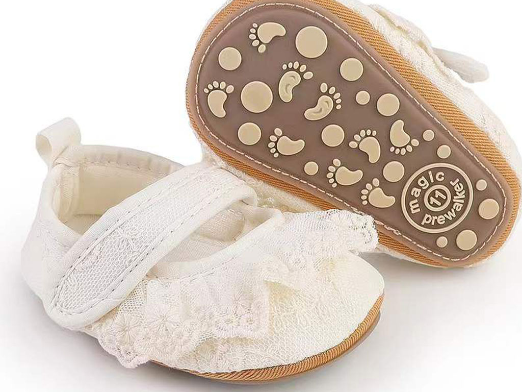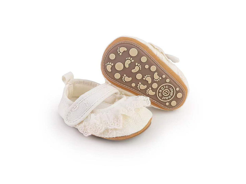 پاپوش شیری رنگ استپ دار نوزادی دخترانه طرح گیپور توردار