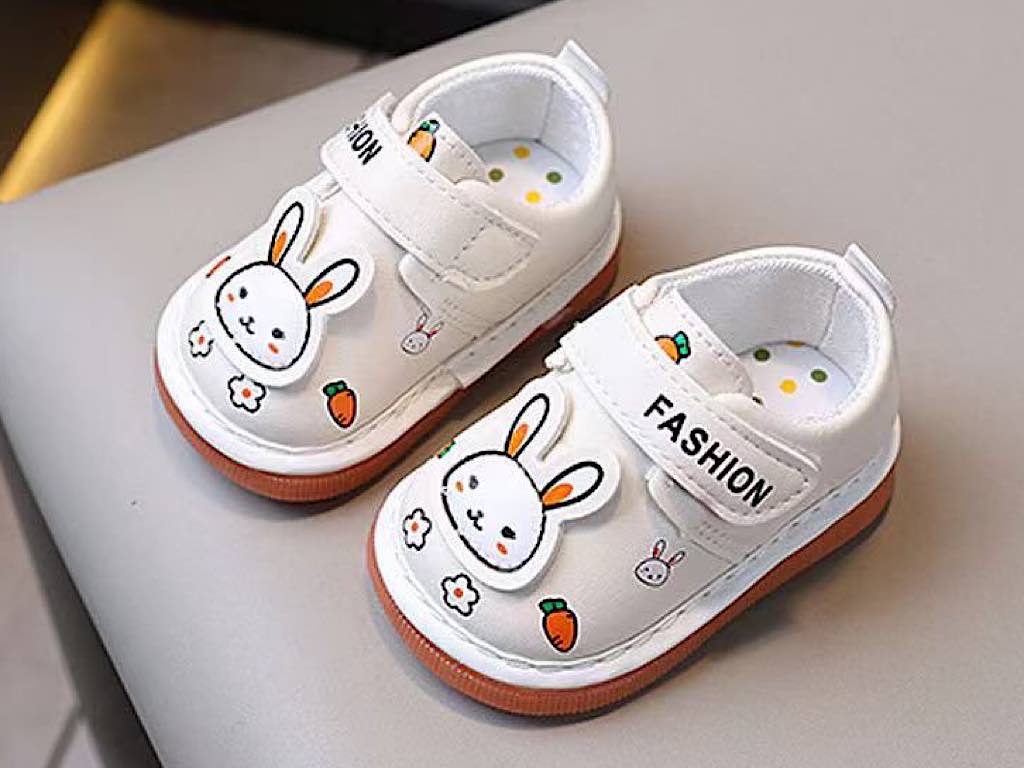 کفش سوتی دخترانه نوزادی رنگ کرم/سفید طرح خرگوش و هویج