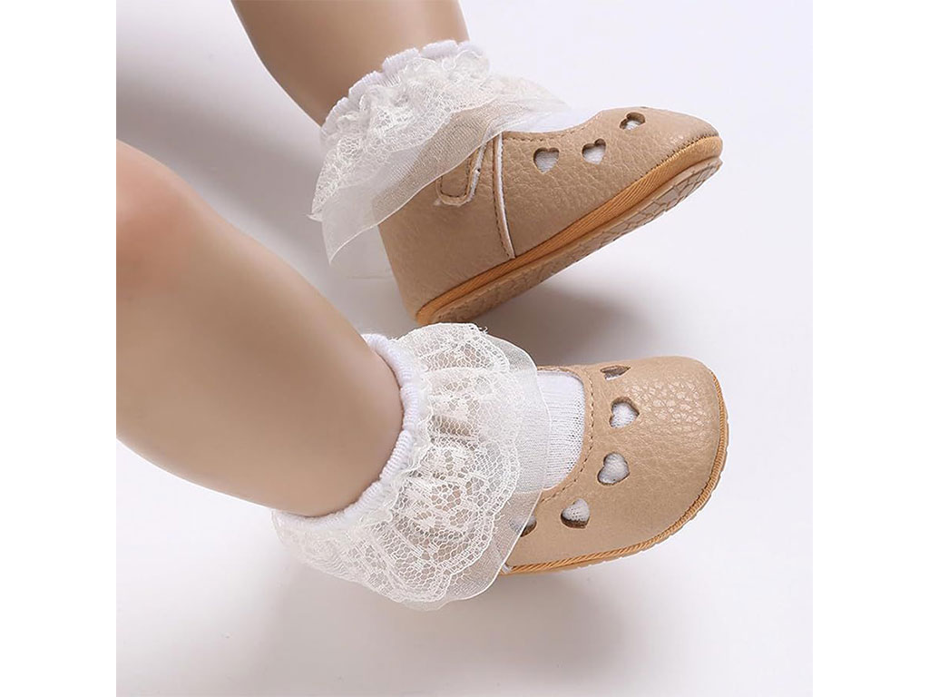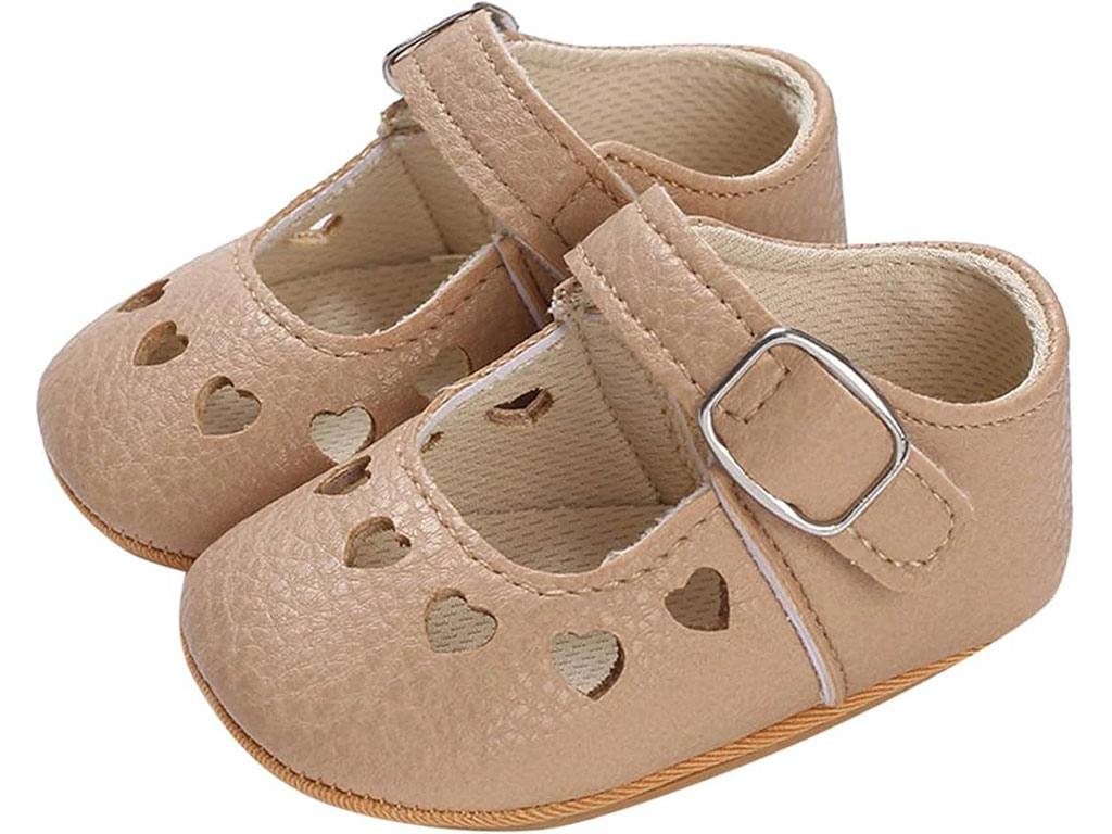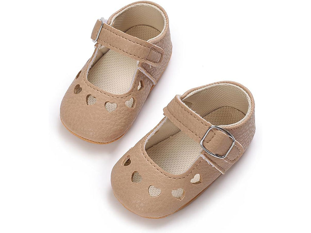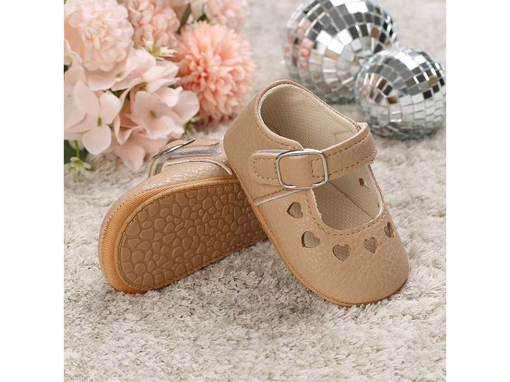 پاپوش نسکافه ای رنگ استپ دار نوزادی دخترانه طرح قلب