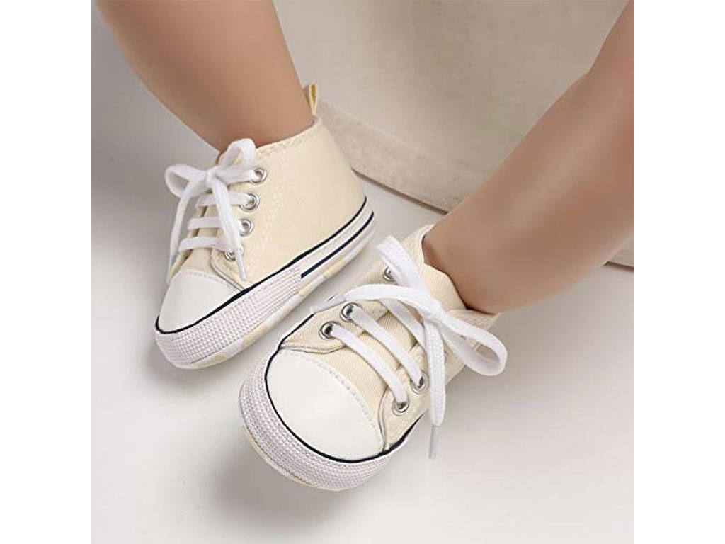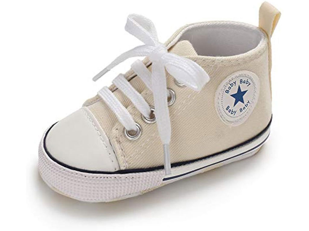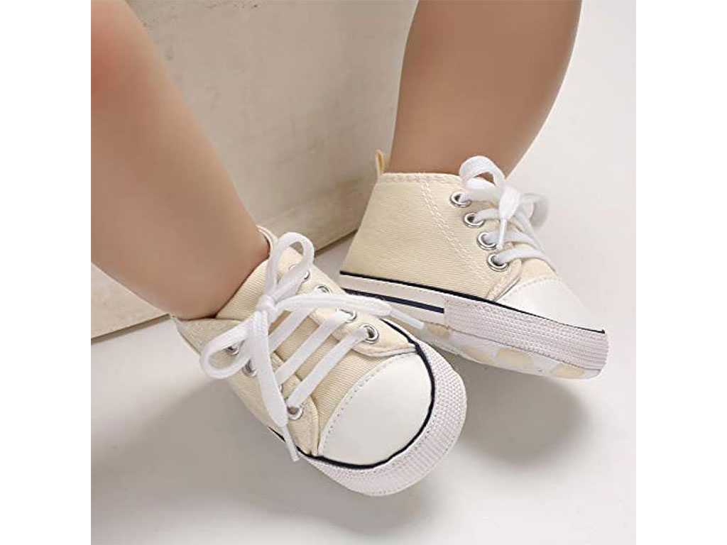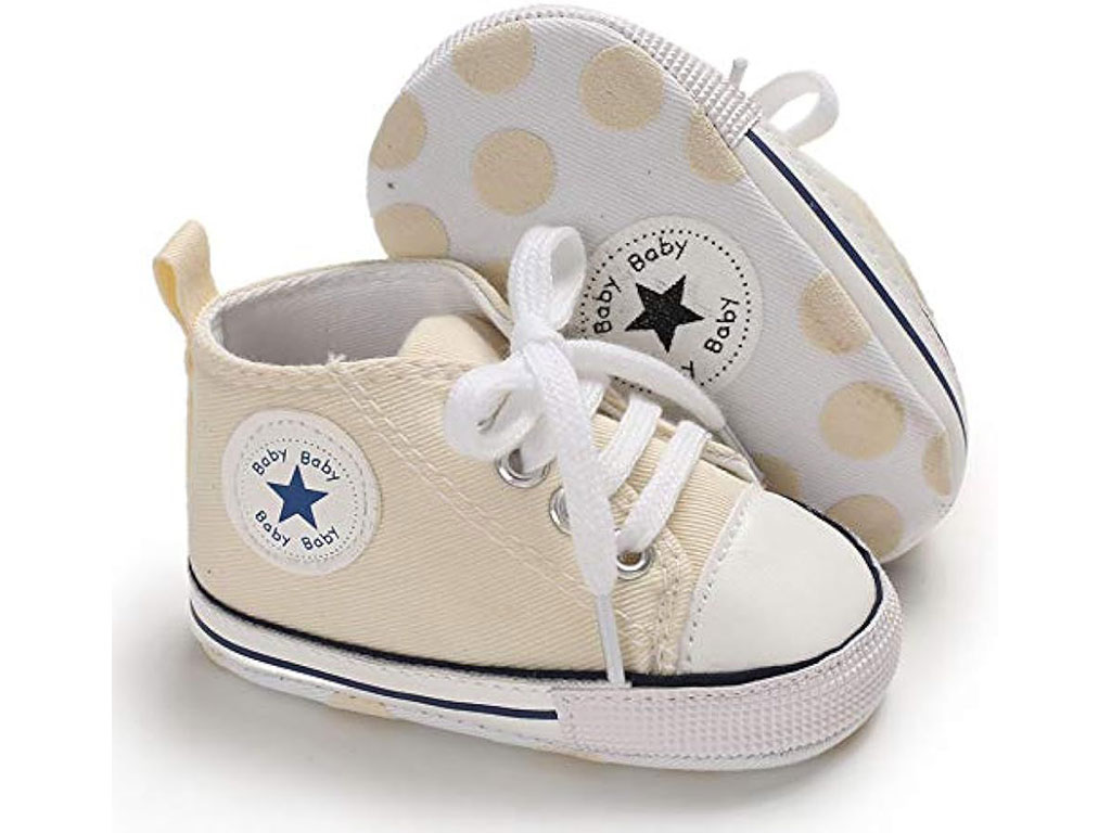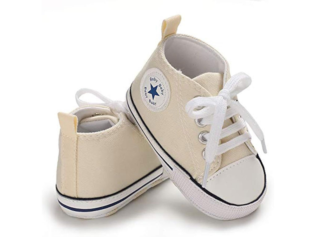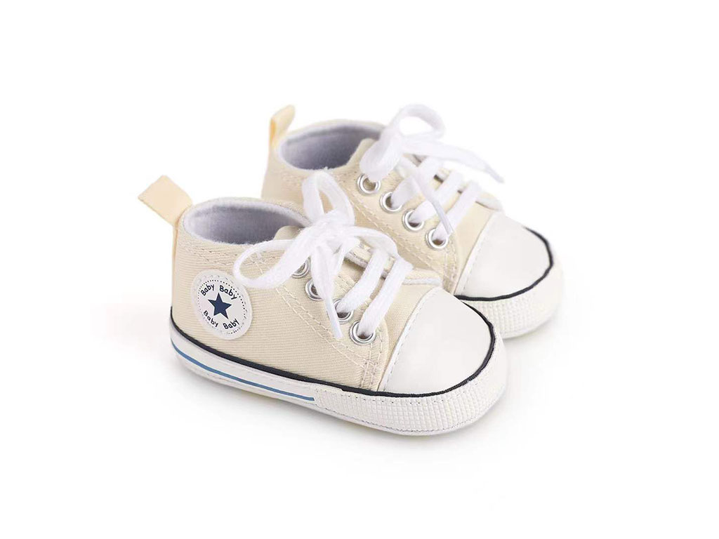 پاپوش استپ دار نوزادی پسرانه با طرح آل استار Baby Baby دارای سه سایز 0-6 و 6-12 و 12-18 ماه می باشد.جنس رویه این محصول ترکیب پارچه به رنگ کرم و چرم مصنوعی در قسمت نوک پاپوش بوده و توسط چهار ردیف بند به راحتی پای دلبندان می شود که بسیار شیک و بی نظیر است.