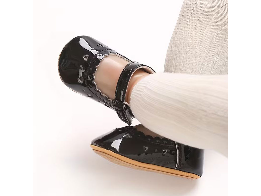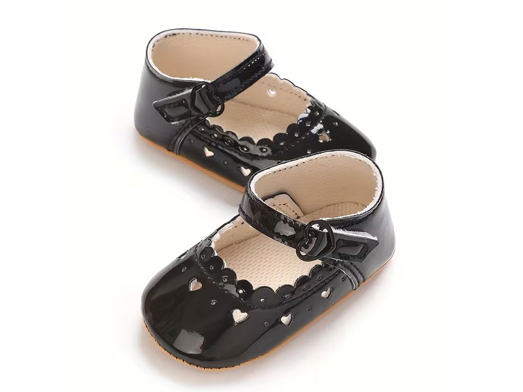 پاپوش مشکی رنگ استپ دار نوزادی دخترانه طرح لبه قلب دار