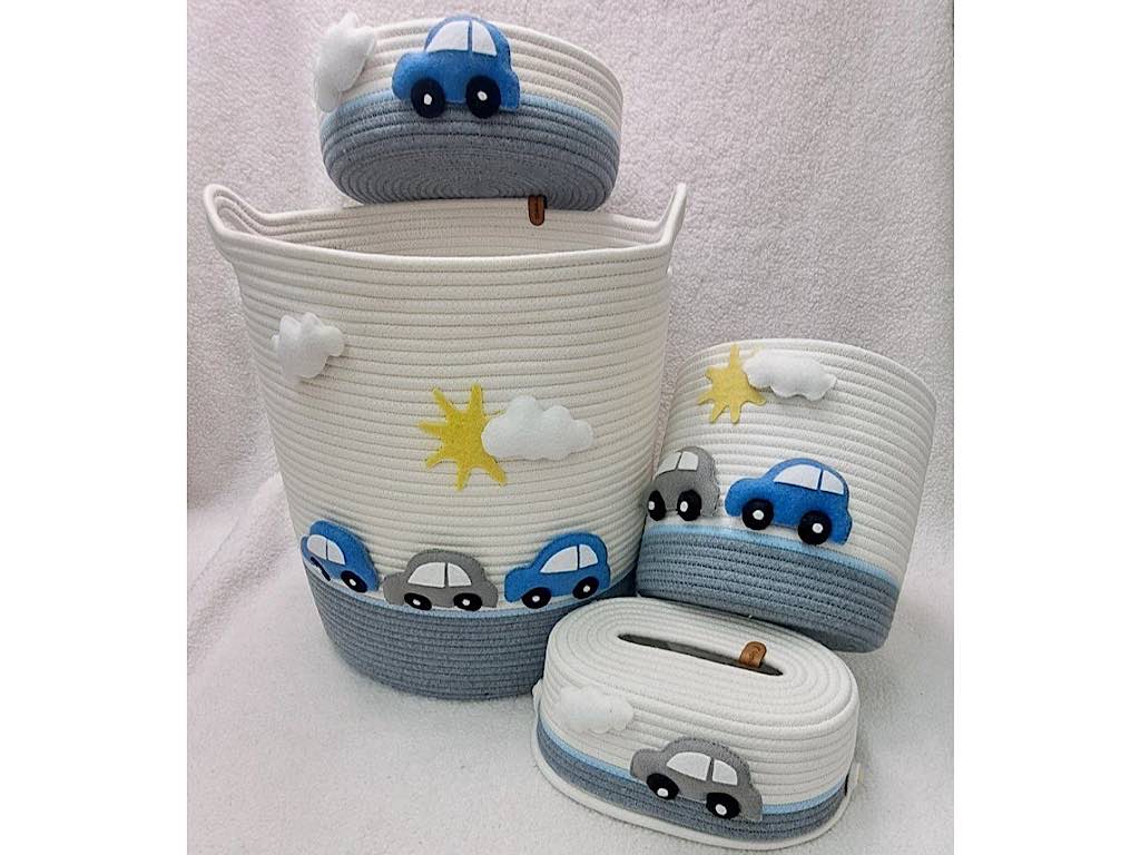 سبد لباس و سطل زباله و جای دستمال و سبد لوسیون قیطون دوزی شده طرح ماشین