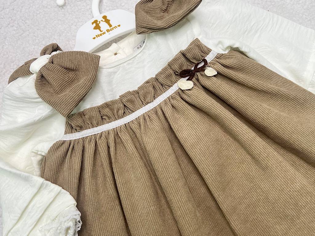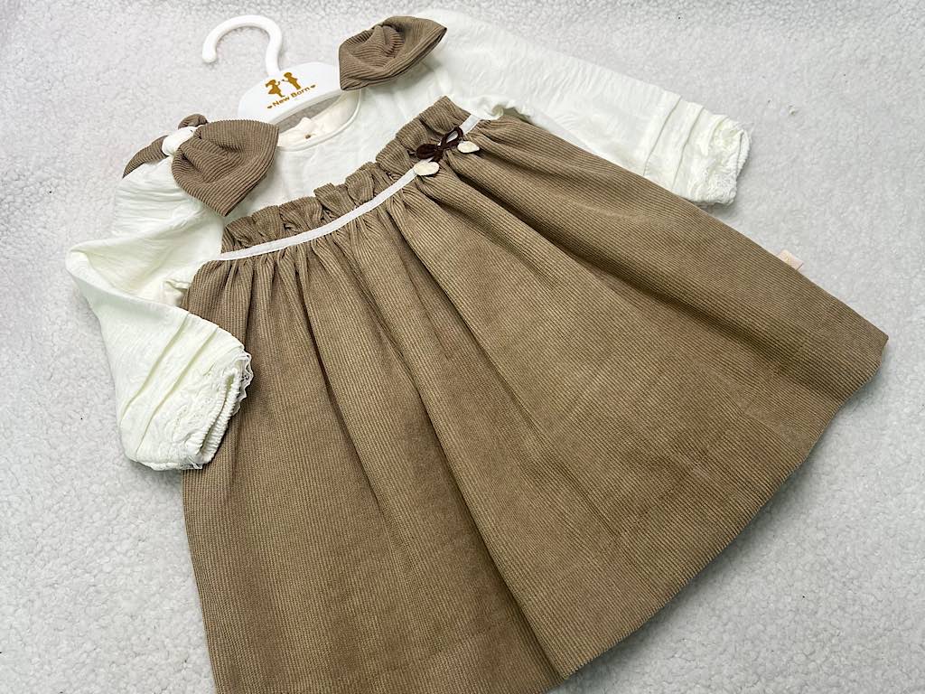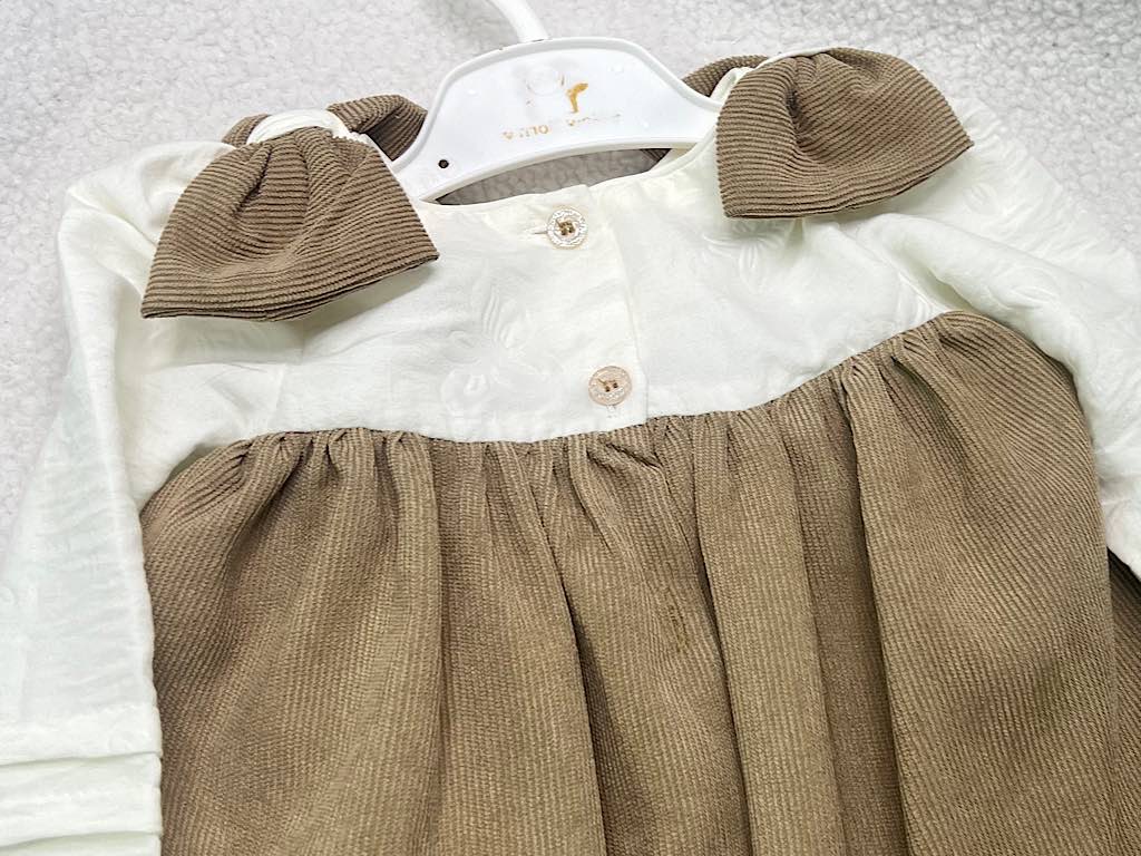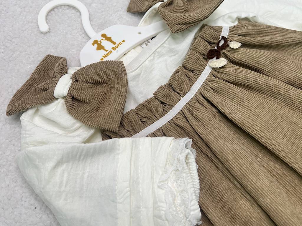 پیراهن دخترانه مخمل نسکافه ای جلو سینه پلیسه پاپیون دار نیوبرن New Born