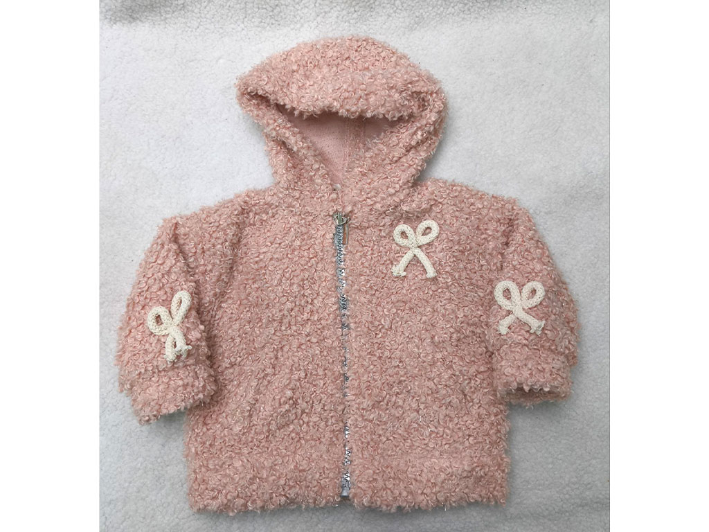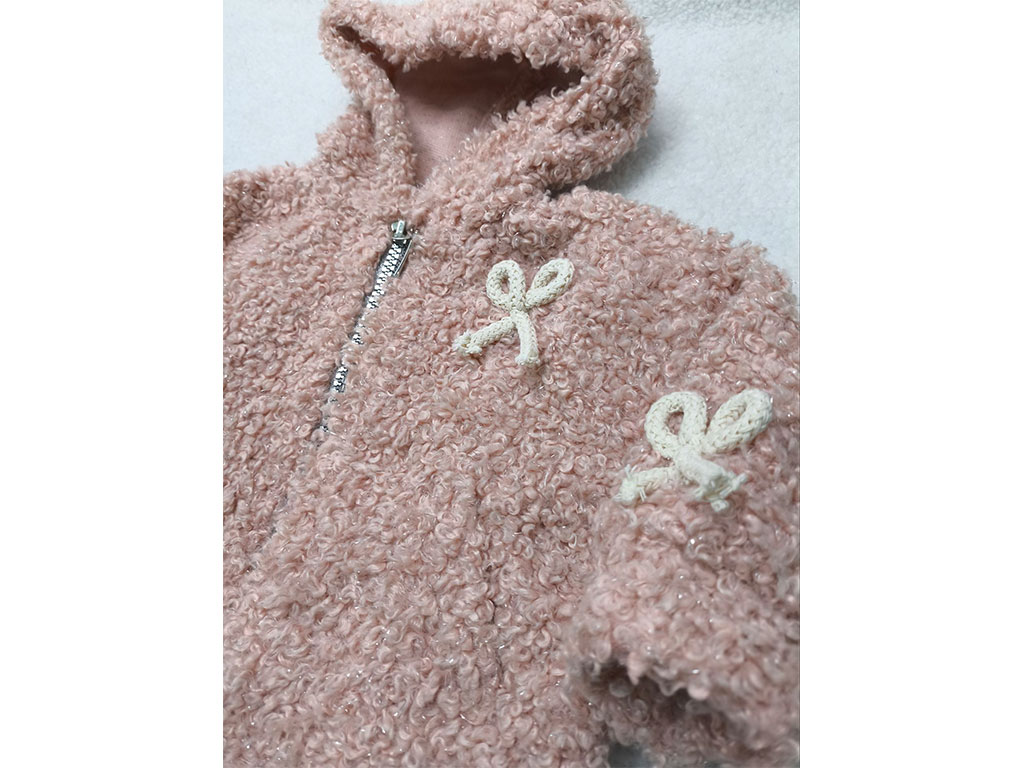 سوئیشرت پولیش لمه صورتی رنگ دخترانه زیپ دار طرح پاپیون ،سوئیشرت نوزادی دخترانه صورتی که طرح پاپیون طناب شده بر روی سینه لباس و آستین ها کار شده است و داخل کرکی و گرم می باشد و داری جیب در دو طرف لباس است.جلوی لباس زیپ قرار گرفته تا روند تعویض لباس کودک به راحتی صورت گیرد و مناسب فصل پاییز و زمستان می باشد .برای شستشوی این لباس بهتر است آن را با دست و با آب با دمای 30 درجه بشویید.