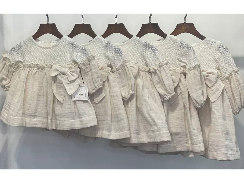 سارافون نوزادی رنگ کرم دخترانه کنفی بالا گیپور طرح پاپیون