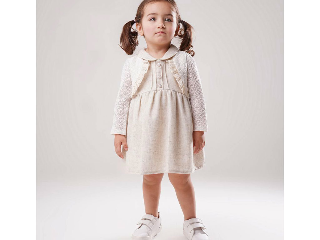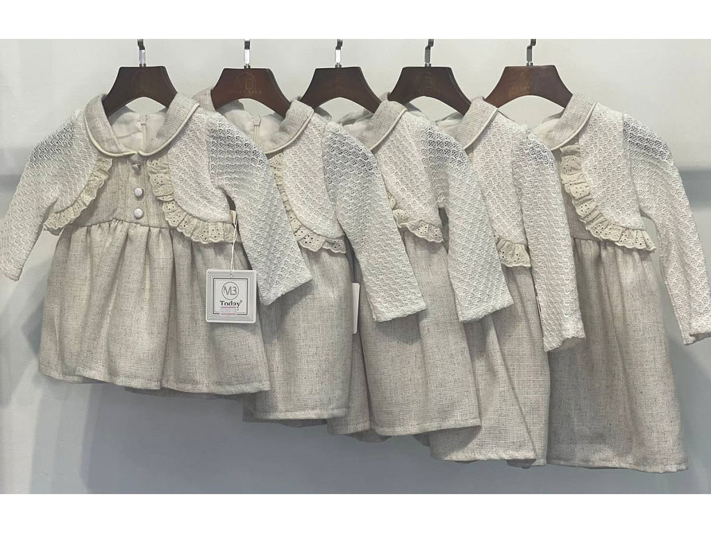 پیراهن نوزادی رنگ کرم دخترانه کنفی کت نما گیپور طرح یقه ب ب سه دکمه
