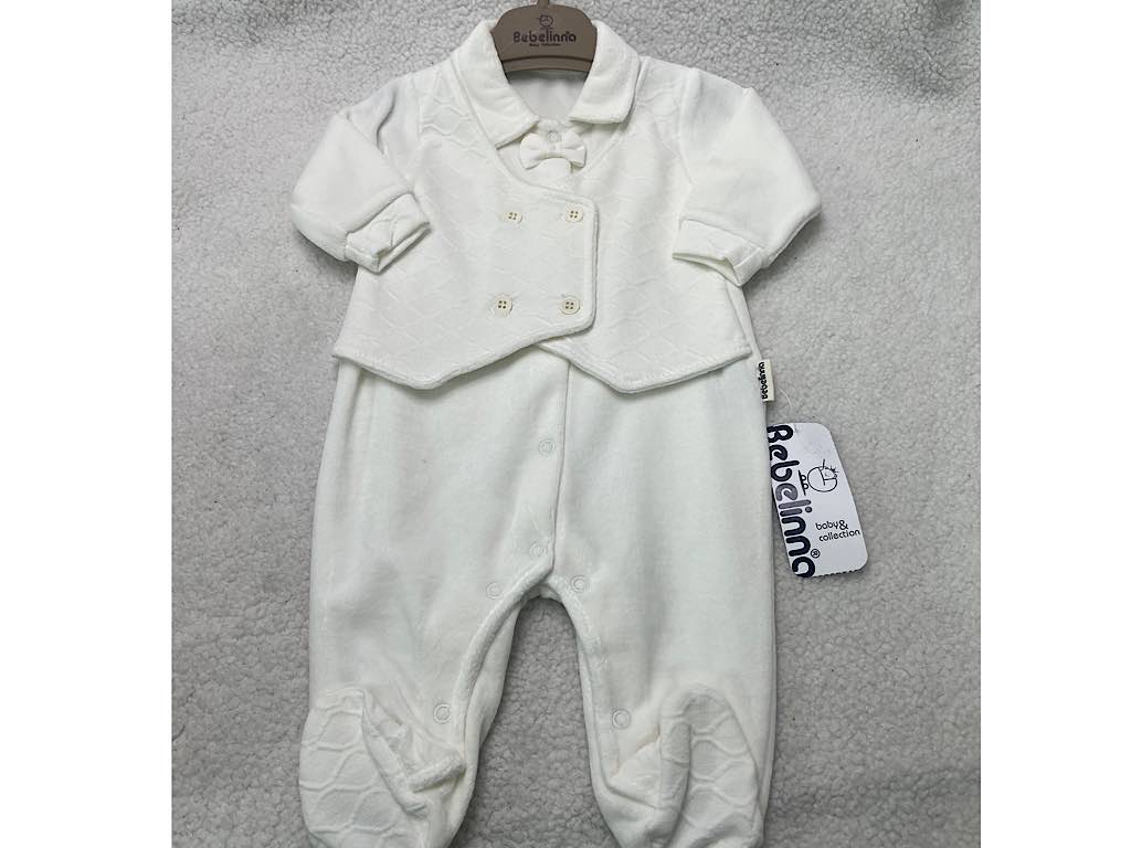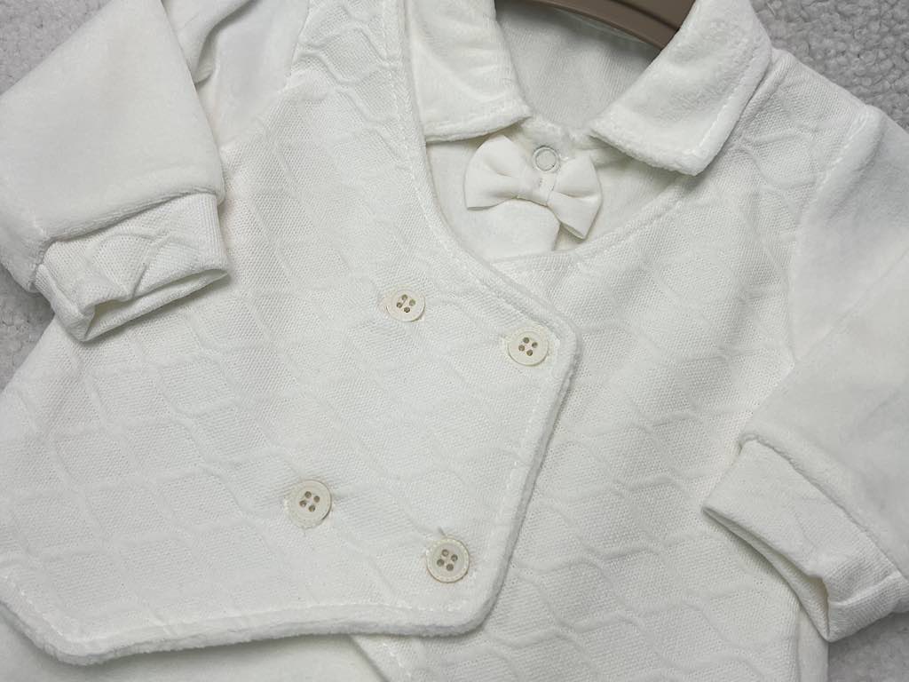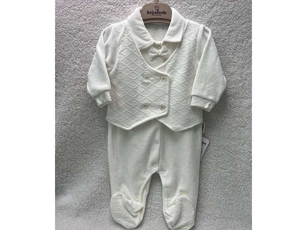 سرهمی جوراب و جلیقه دار مخملی نوزادی پسرانه شیری رنگ بب لینا BEBELINNA
