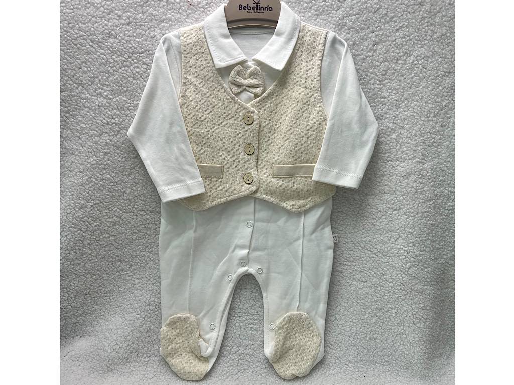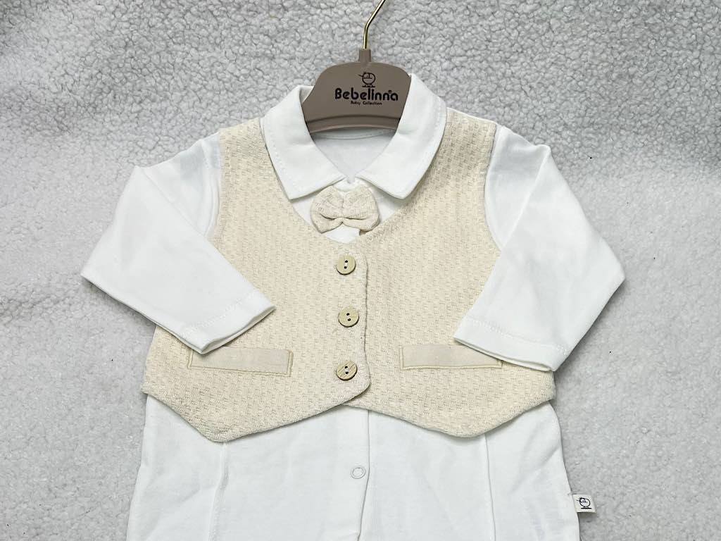سرهمی جوراب و جلیقه دار نوزادی پسرانه شیری با جلیقه کرم رنگ بب لینا BEBELINNA