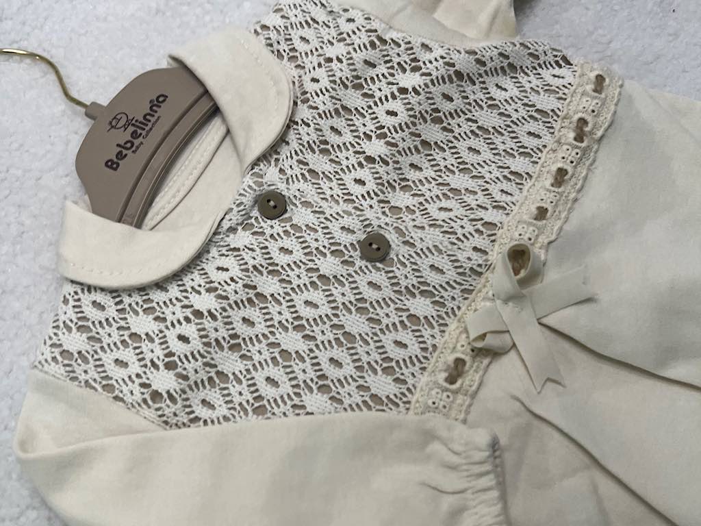 #سرهمی جورابدار جلو سینه قلاب دوزی شده نوزادی دخترانه کرم رنگ بب لینا BEBELINNA