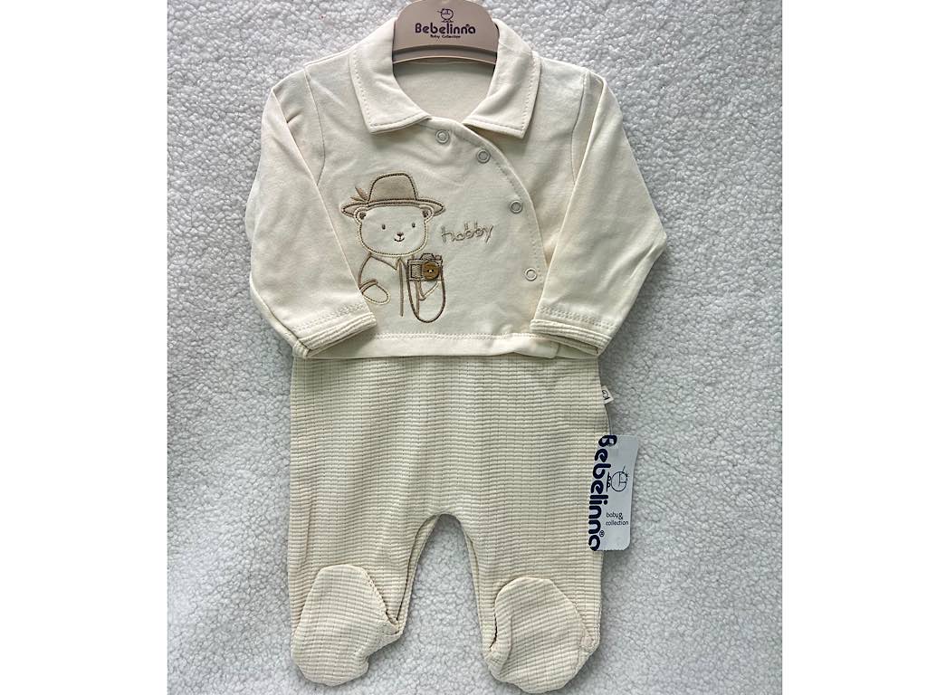 سرهمی جوراب دار نوزادی پسرانه بیسکویتی کرم طرح خرس شاد بب لینا BEBELINNA