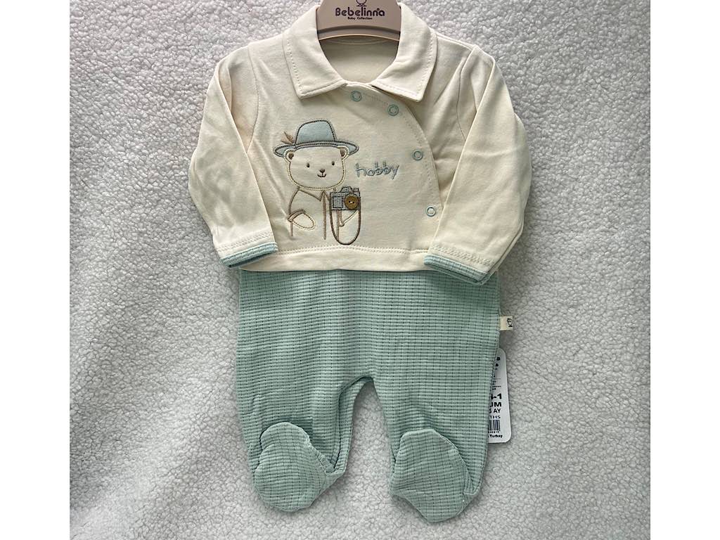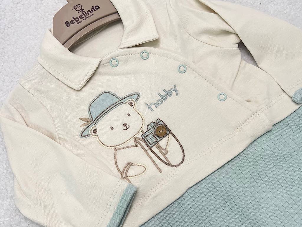 سرهمی جوراب دار نوزادی پسرانه بیسکویتی سبز آبی طرح خرس شاد بب لینا BEBELINNA