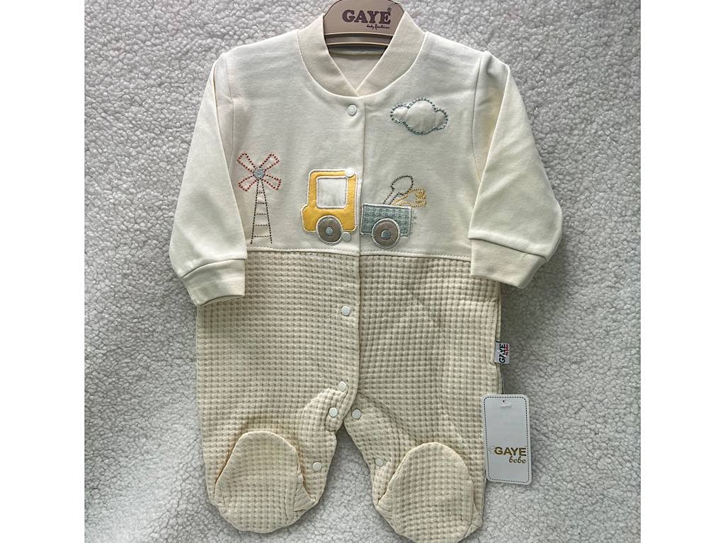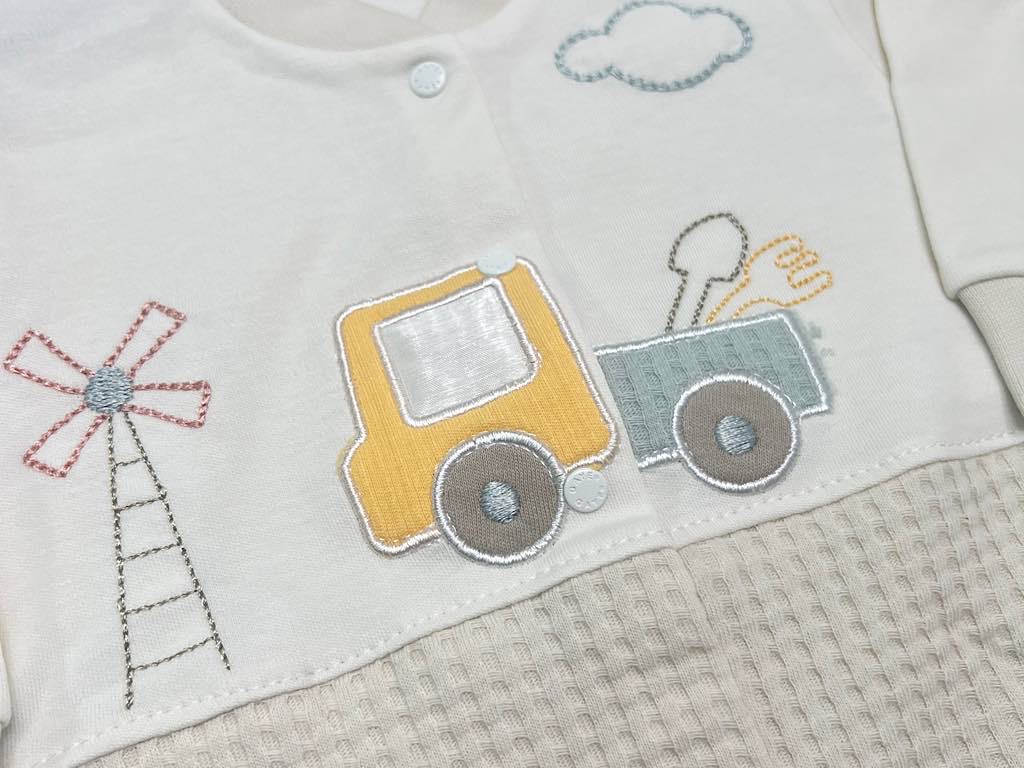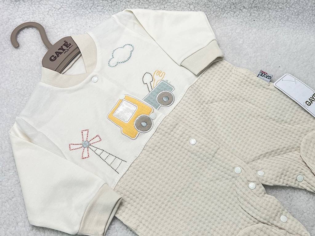 سرهمی جوراب دار نوزادی پسرانه بیسکویتی کرم طرح تراکتور گایه G.A.Y.E