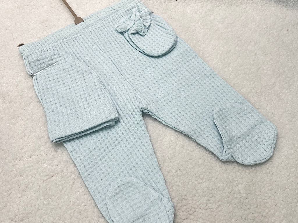 ست پنج تکه g.a.y.e ترکیه ؛ ست پنج تکه بیمارستانی نوزادی که جنس آن 100%کتان(نخ پنبه) میباشد و شامل : بلوز مانتویی جلیقه دار، شلوار جورابدار ، پیشبند دستمال گردنی ، کلاه گرد و دستکش بوده که بلوز مانتویی با چهار دکمه فشاری دارد و جلوی آن طرح جلیقه داردو جیب با طرح گلدوزی تدی روی آن به کار رفته است.