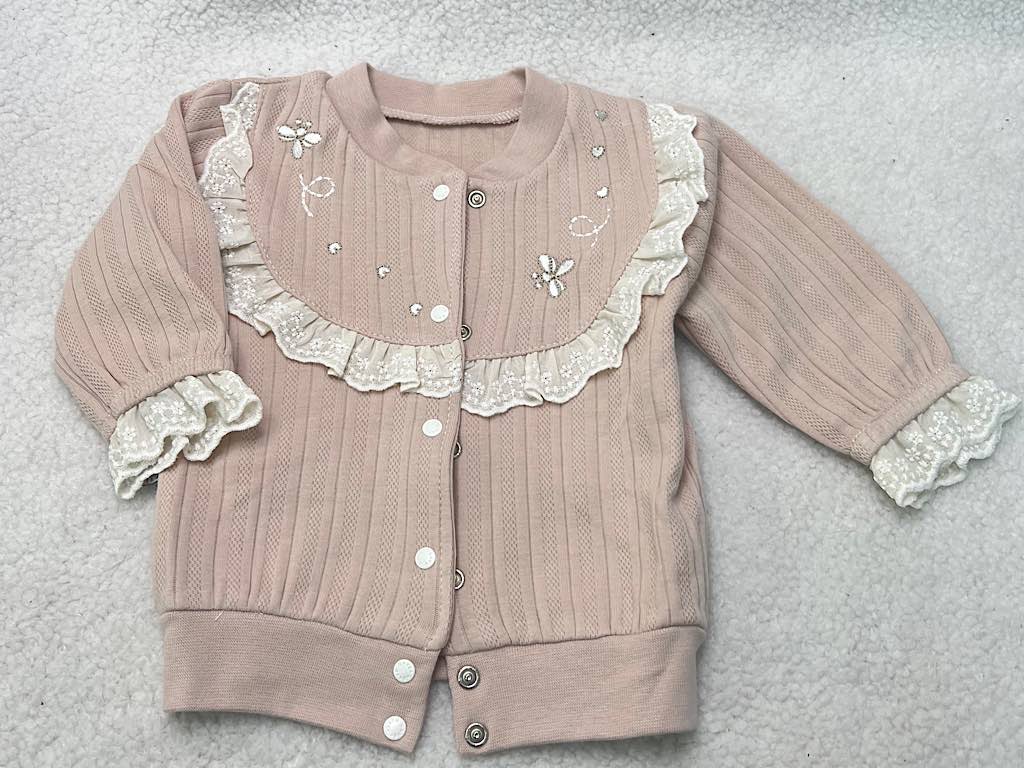 - شامل یک بلوز آستین بلند که روی سرشانه دو دکمه فشاری دارد و یک عدد شلوار کمر کش که لبه پایینی شلوار نوار دانتل دوزی دارد و یک عدد کت مانتویی با دکمه های فشاری و گلدوزی طرح گل و زنبور با نوار دانتل سر آستین که ست مجلسی را کامل کرده است.